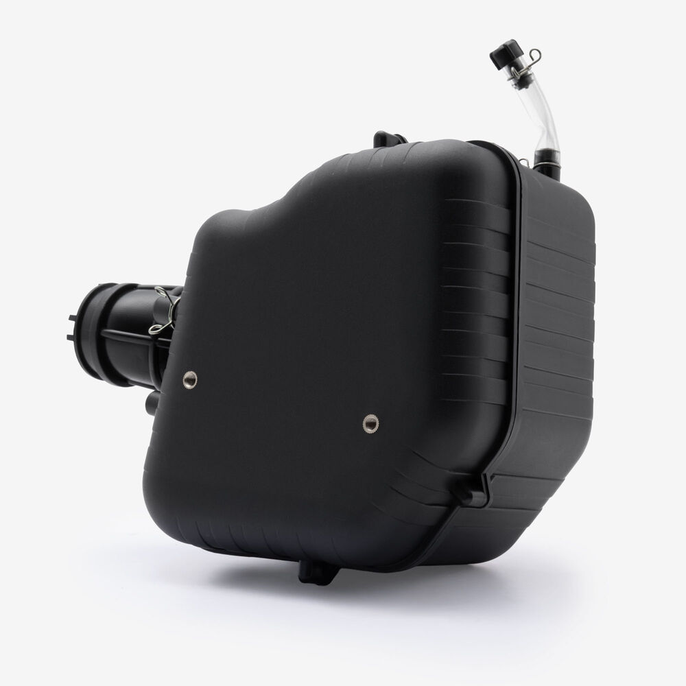 An airbox is an empty chamber on the inlet of most combustion engines. It collects air from outside and feeds it to the intake hoses of each cylinder.