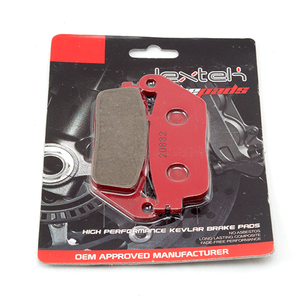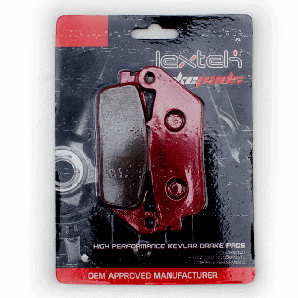 Lextek brake pads now contain Kevlar (TM) for improved durability and less disc abrasion compared with other organic brake pads. Pads are sold as a pair per caliper.