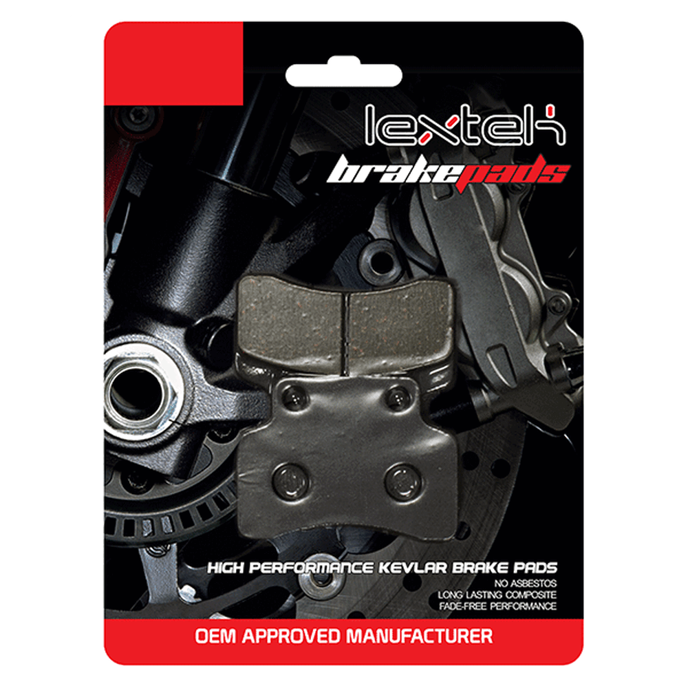Lextek brake pads now contain Kevlar (TM) for improved durability and less disc abrasion compared with other organic brake pads. Pads are sold as a pair per caliper.