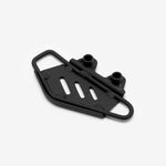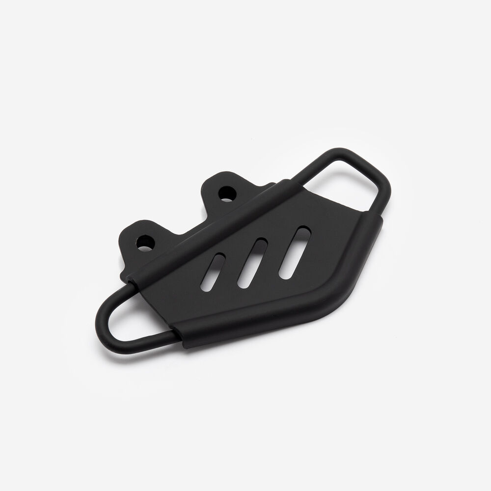 The front brake caliper bracket in a motorcycle is a mounting component that secures the front brake caliper to the front fork or bracket assembly. It ensures proper alignment of the caliper with the brake disc, allowing for efficient braking performance by ensuring that the caliper applies even pressure to the disc.