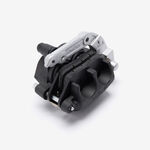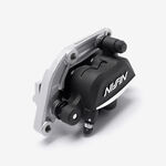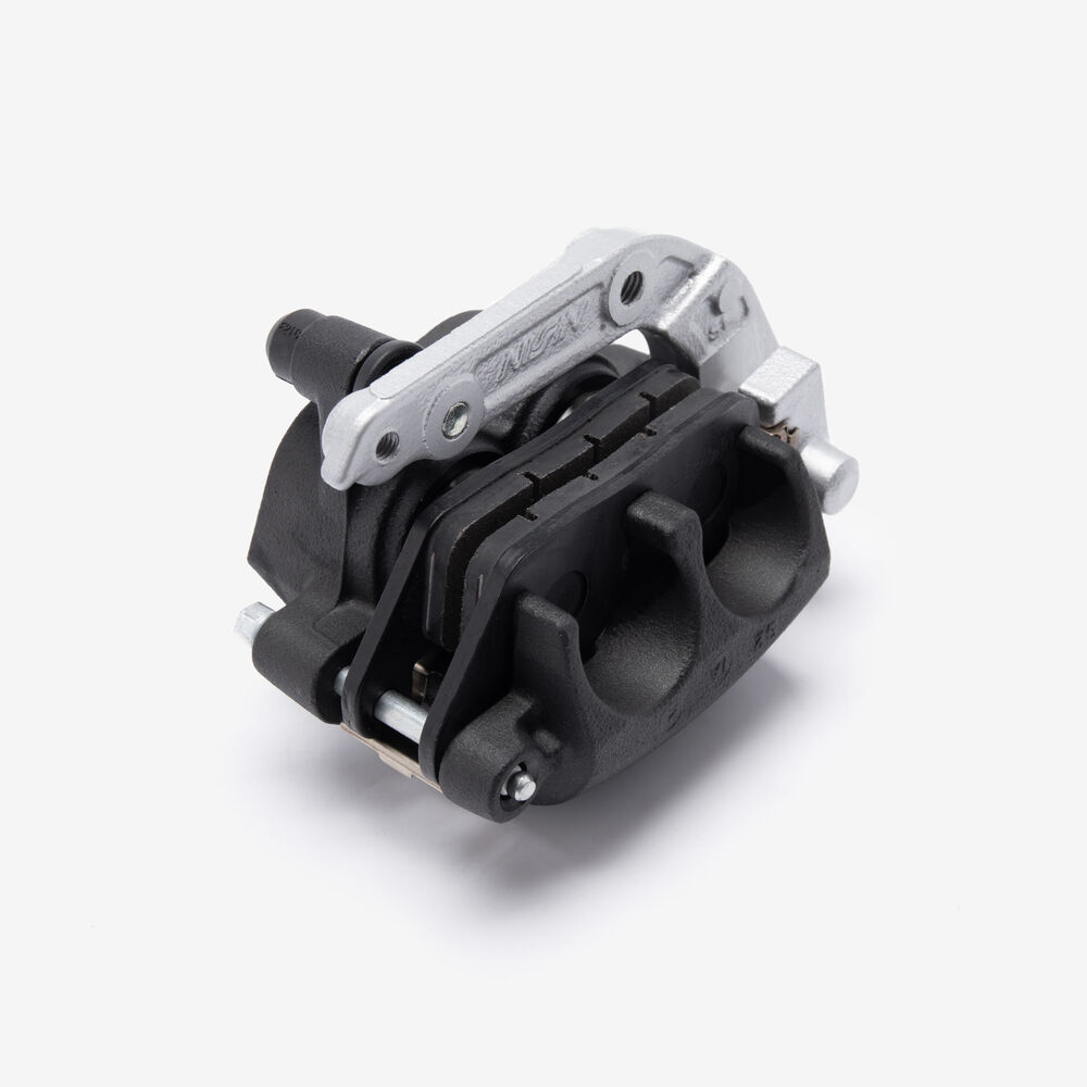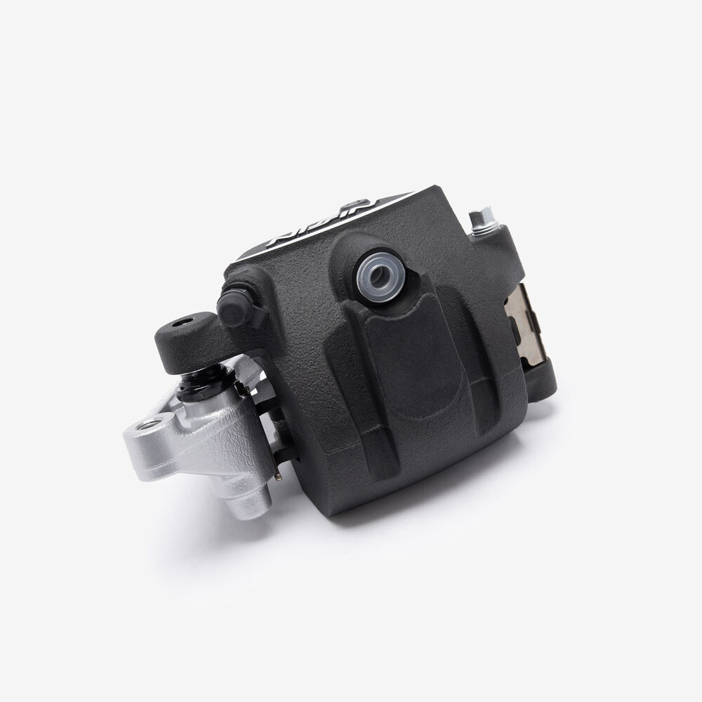 Squeezing the brake lever pushes a hydraulic piston, which sends fluid down the brake lines and into the caliper.