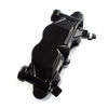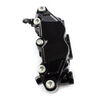 Squeezing the brake lever pushes a hydraulic piston, which sends fluid down the brake lines and into the caliper.