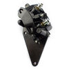 Squeezing the brake lever pushes a hydraulic piston, which sends fluid down the brake lines and into the caliper.