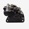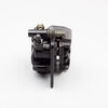 Squeezing the brake lever pushes a hydraulic piston, which sends fluid down the brake lines and into the caliper.