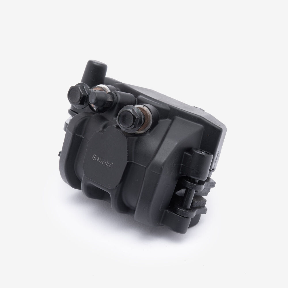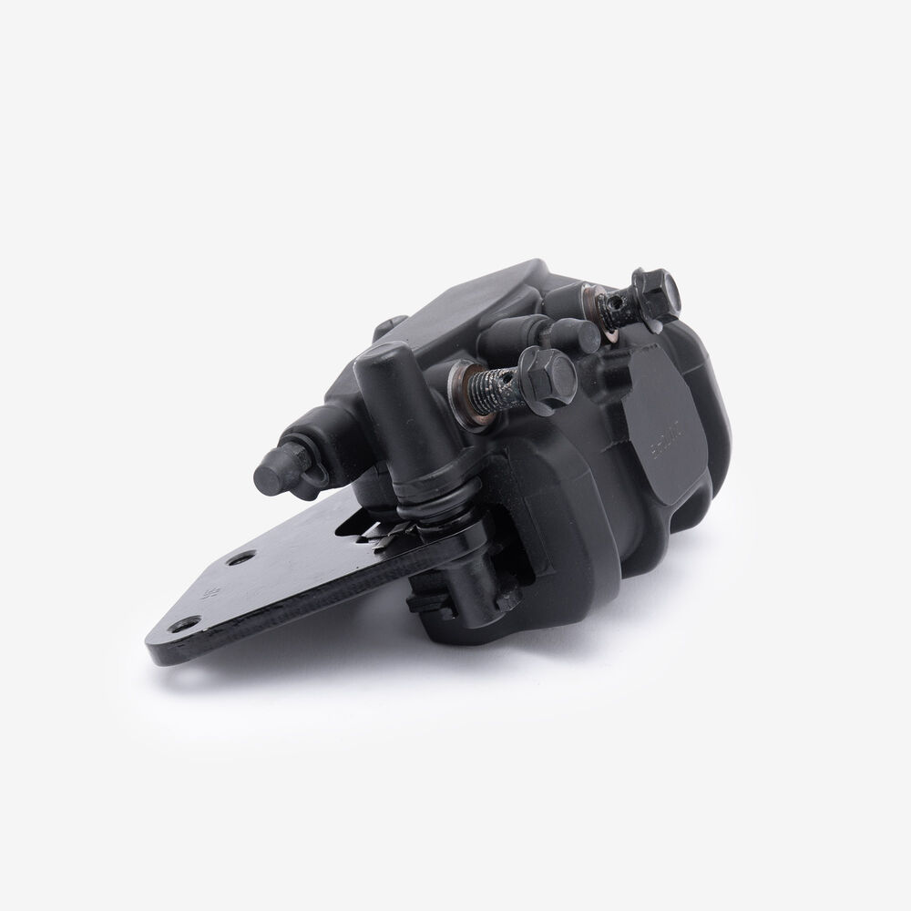 Squeezing the brake lever pushes a hydraulic piston, which sends fluid down the brake lines and into the caliper.