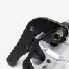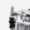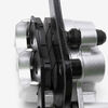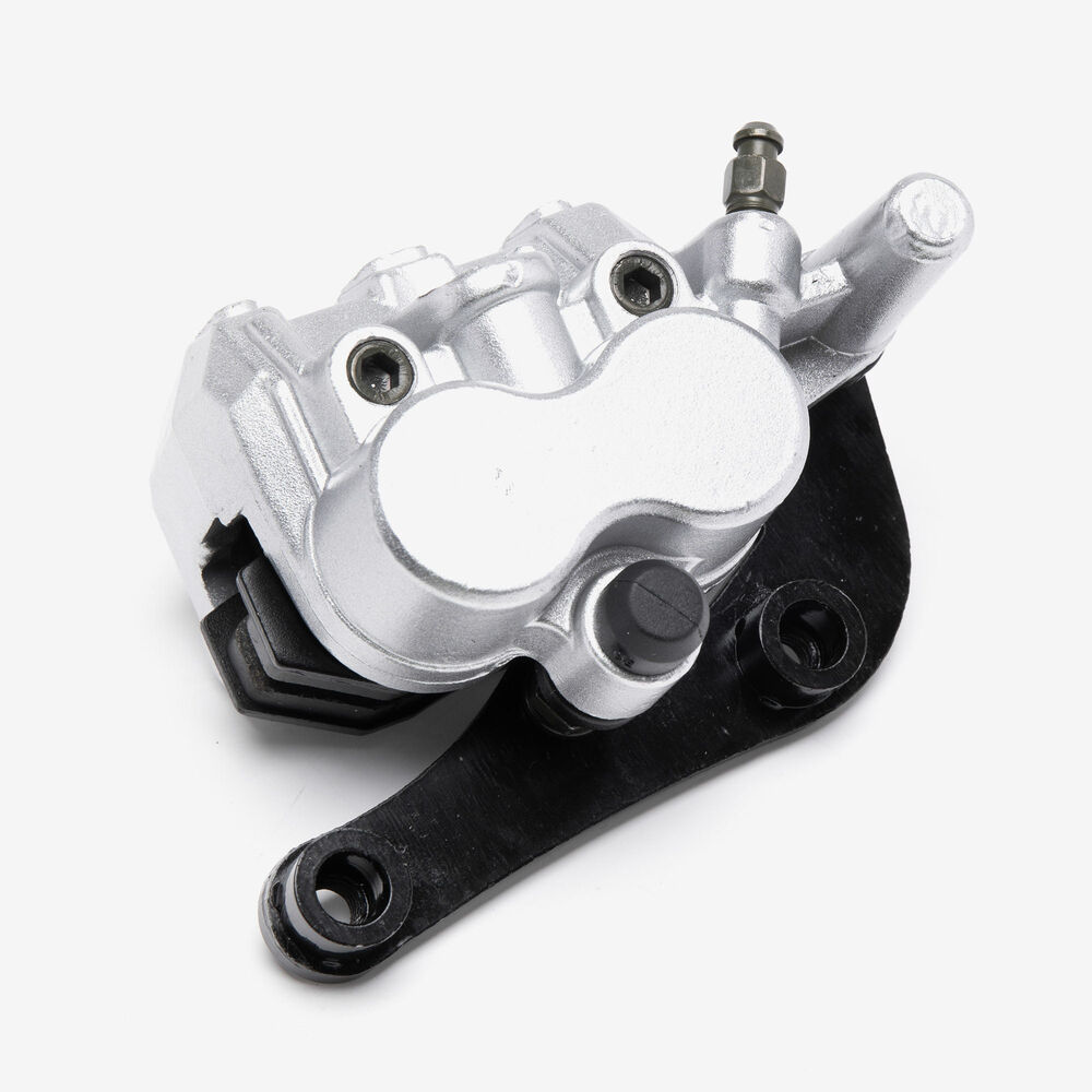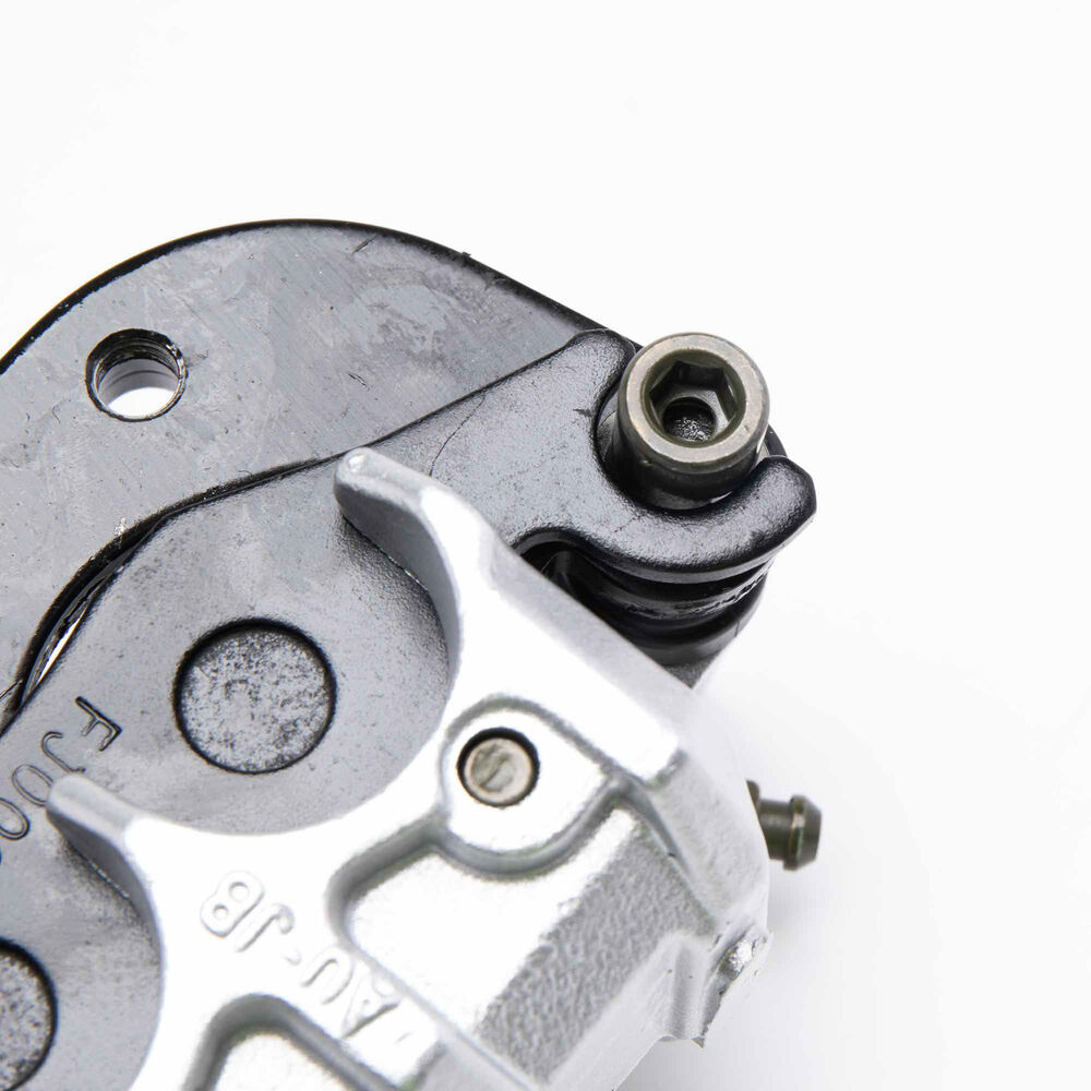 Squeezing the brake lever pushes a hydraulic piston, which sends fluid down the brake lines and into the caliper.