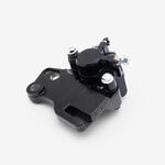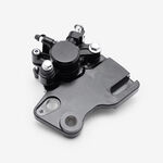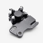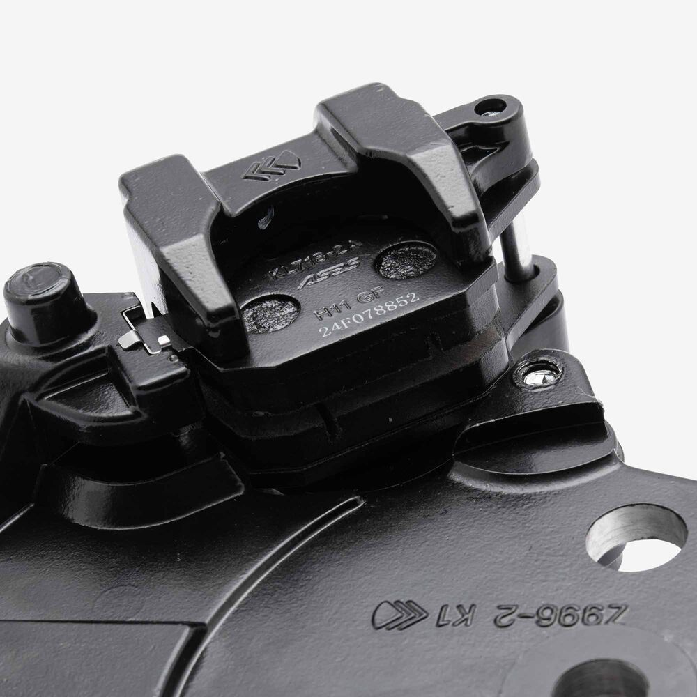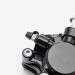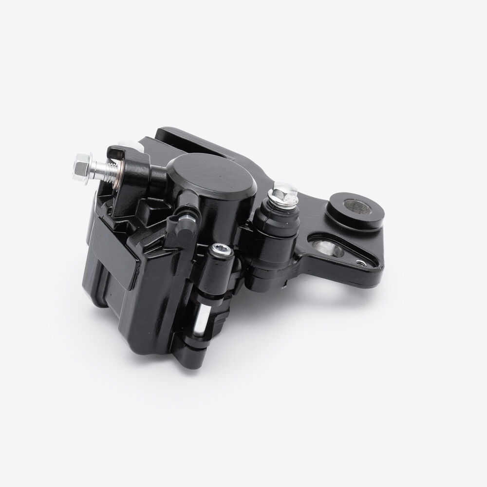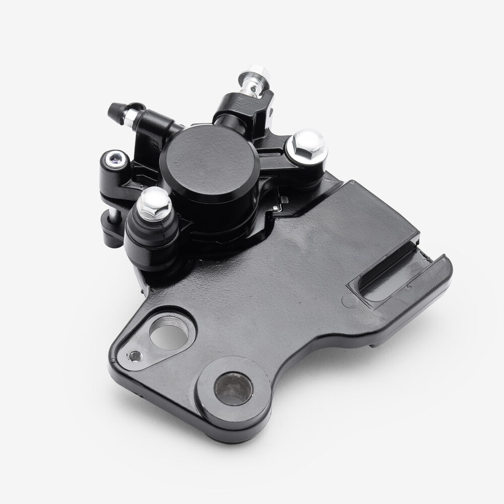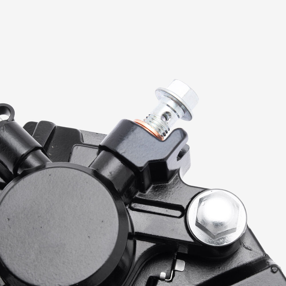 Squeezing the brake lever pushes a hydraulic piston, which sends fluid down the brake lines and into the caliper.