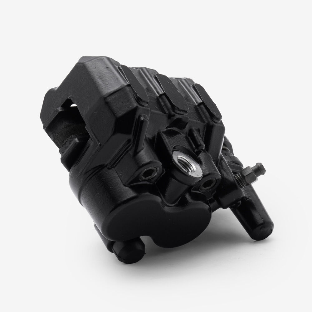 Squeezing the brake lever pushes a hydraulic piston, which sends fluid down the brake lines and into the caliper.