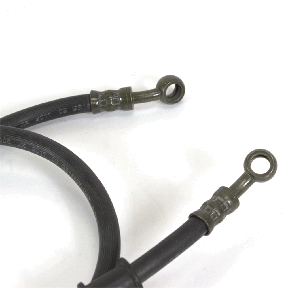 The hose's job is to carry brake fluid from the master cylinder to the caliper on the wheel.