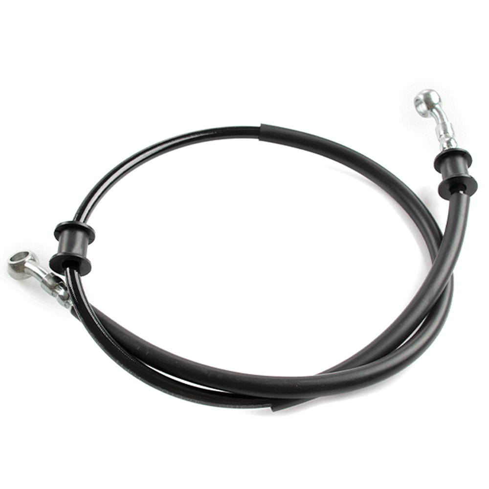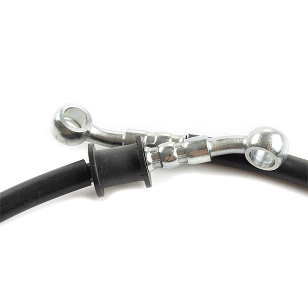 The hose's job is to carry brake fluid from the master cylinder to the caliper on the wheel.
