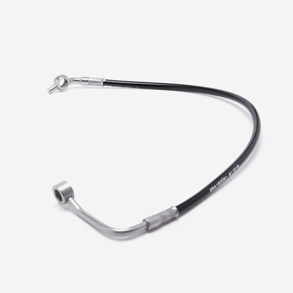 The hose's job is to carry brake fluid from the master cylinder to the caliper on the wheel.