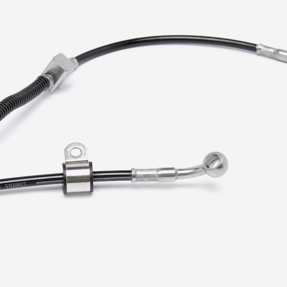 The hose's job is to carry brake fluid from the master cylinder to the caliper on the wheel.