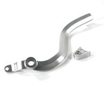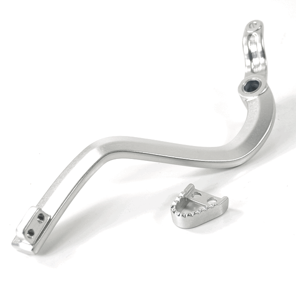 The rear brake pedal in a motorcycle is a foot-operated lever that controls the rear brake system. When pressed, it activates the rear brake caliper or drum, applying braking force to the rear wheel to slow down or stop the motorcycle, enhancing overall control and safety.