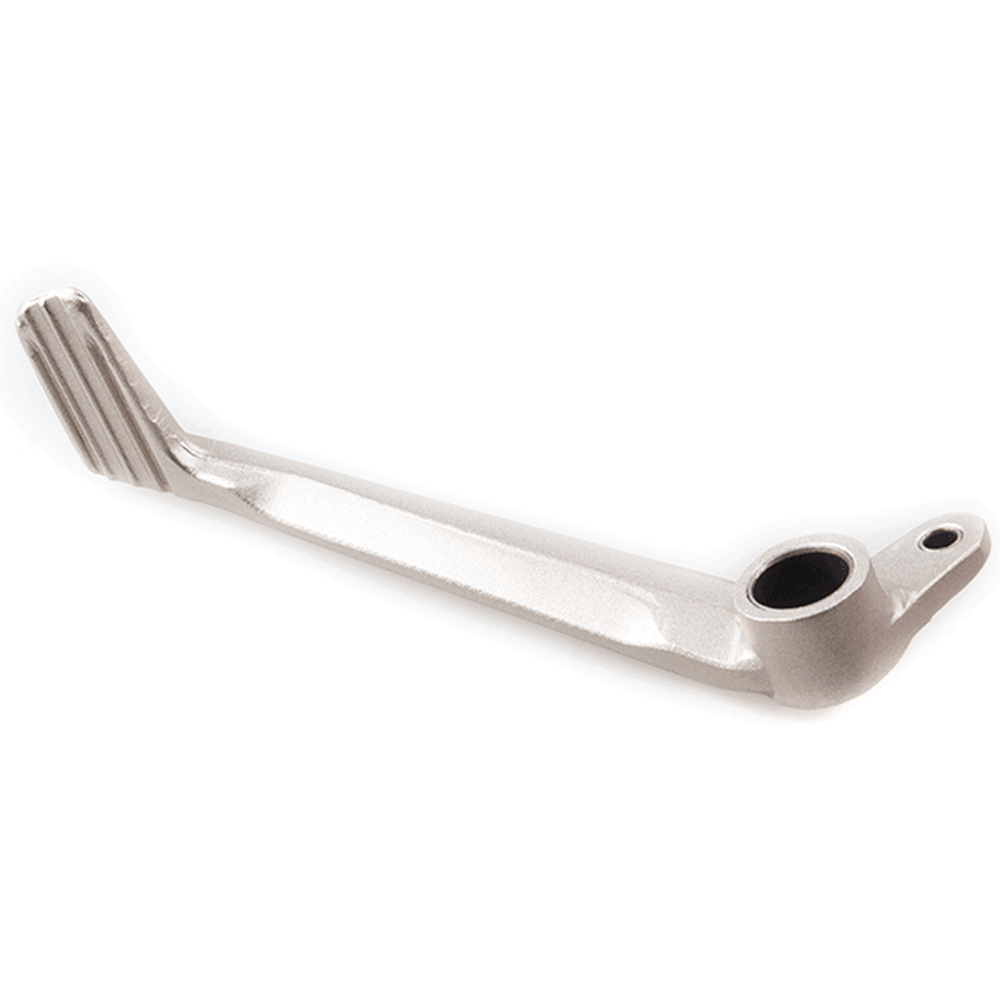 The rear brake pedal in a motorcycle is a foot-operated lever that controls the rear brake system. When pressed, it activates the rear brake caliper or drum, applying braking force to the rear wheel to slow down or stop the motorcycle, enhancing overall control and safety.