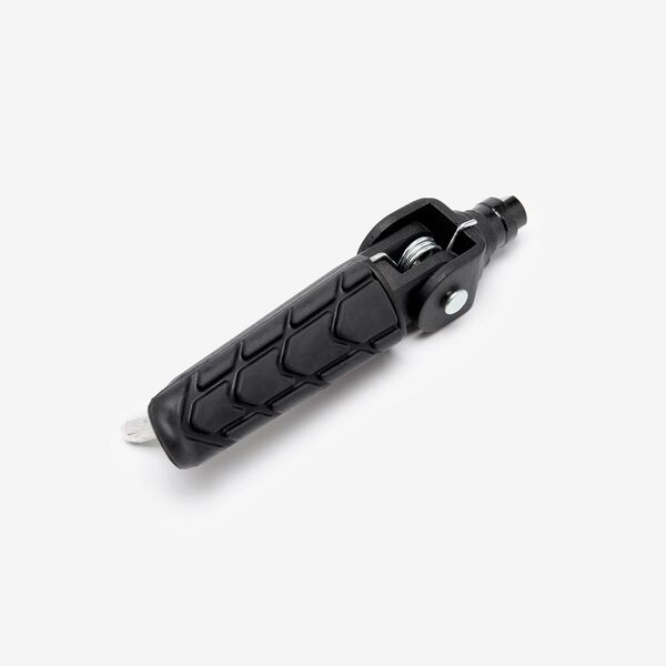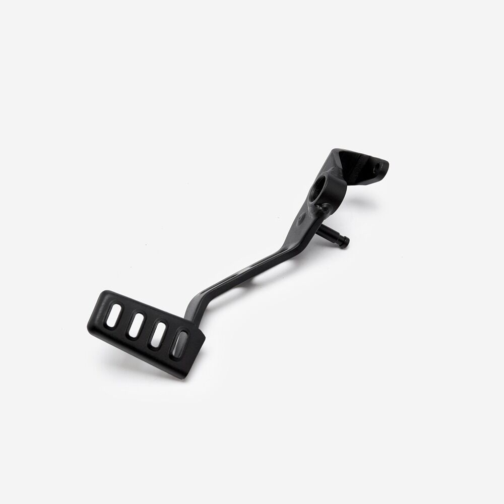 The rear brake pedal in a motorcycle is a foot-operated lever that controls the rear brake system. When pressed, it activates the rear brake caliper or drum, applying braking force to the rear wheel to slow down or stop the motorcycle, enhancing overall control and safety.