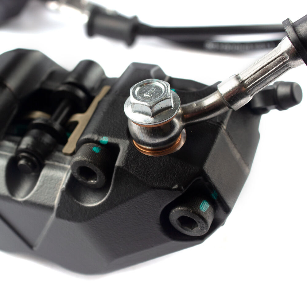 Modern motorcycle brakes work by transferring movement and force at the lever through an incompressible liquid to the caliper pistons, which then press the brake pads against the disc.