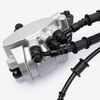Modern motorcycle brakes work by transferring movement and force at the lever through an incompressible liquid to the caliper pistons, which then press the brake pads against the disc.
