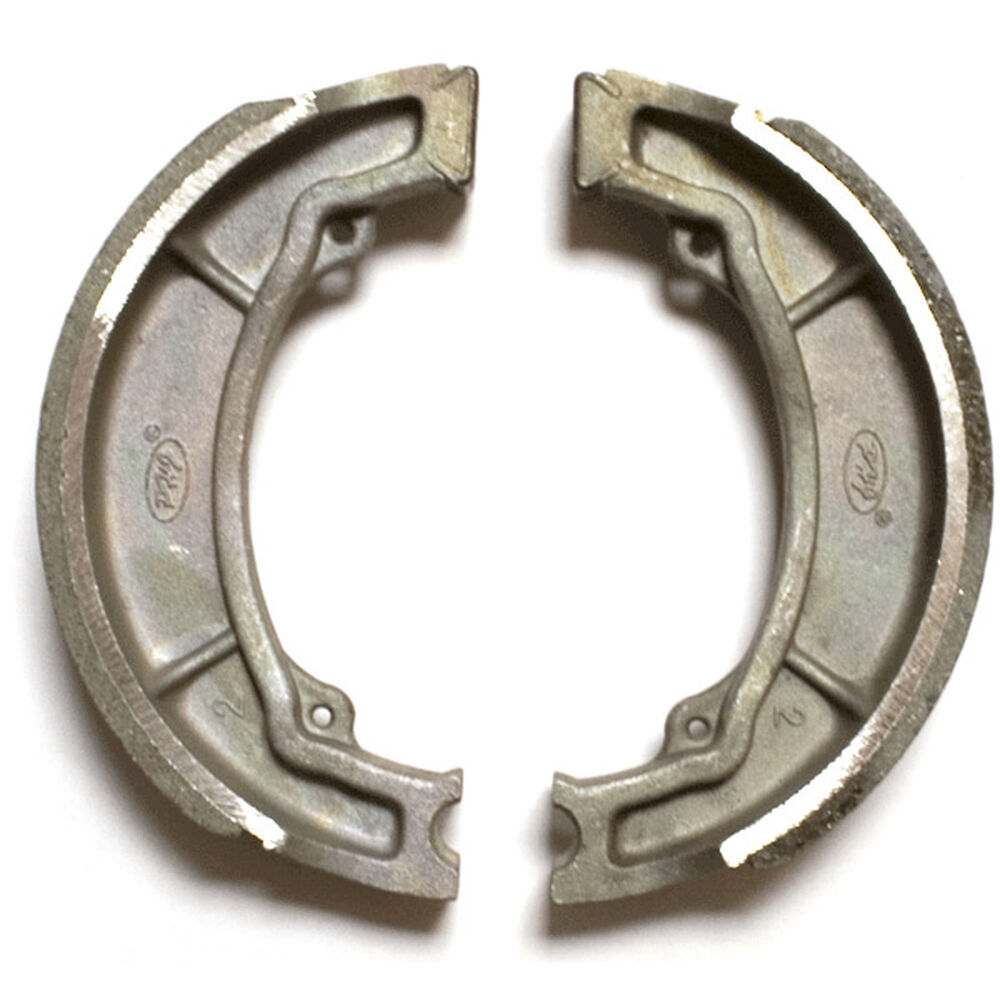 Brake shoes are components of the drum brake assembly. They are forced to press against the inner surface of the brake drum. The friction produced between the shoes and the drum works to reduce speed and stop the motorcycle.