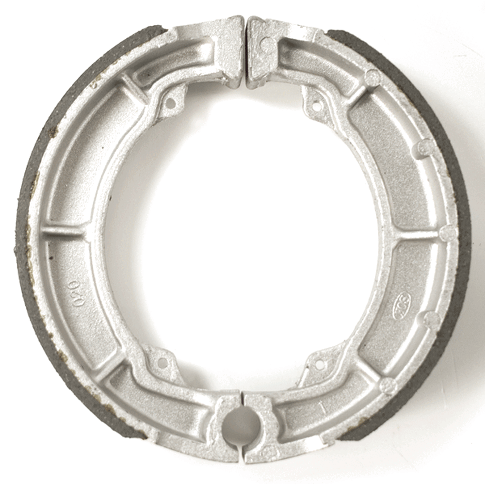 Brake shoes are components of the drum brake assembly. They are forced to press against the inner surface of the brake drum. The friction produced between the shoes and the drum works to reduce speed and stop the motorcycle.