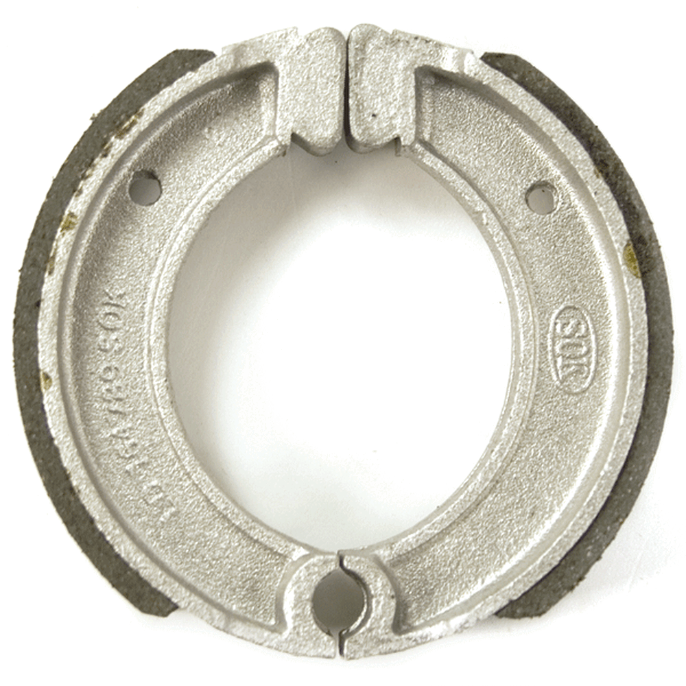 Brake shoes are components of the drum brake assembly. They are forced to press against the inner surface of the brake drum. The friction produced between the shoes and the drum works to reduce speed and stop the motorcycle.