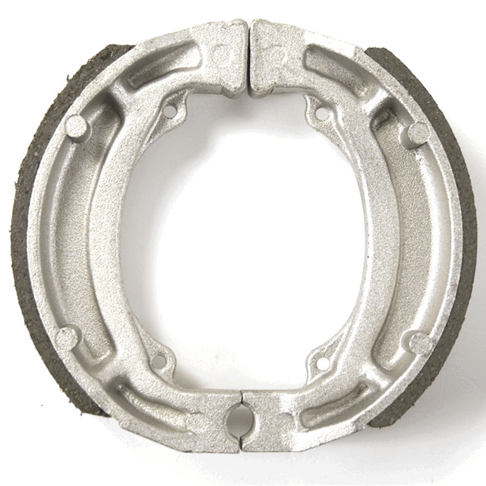 Brake shoes are components of the drum brake assembly. They are forced to press against the inner surface of the brake drum. The friction produced between the shoes and the drum works to reduce speed and stop the motorcycle.