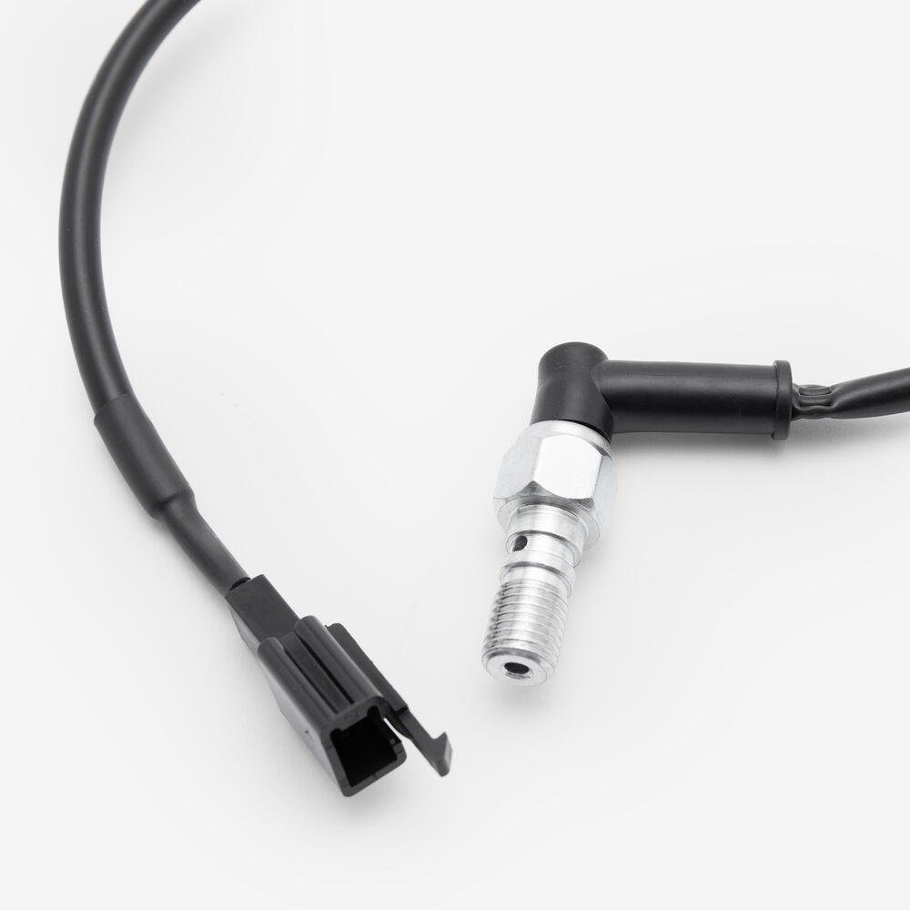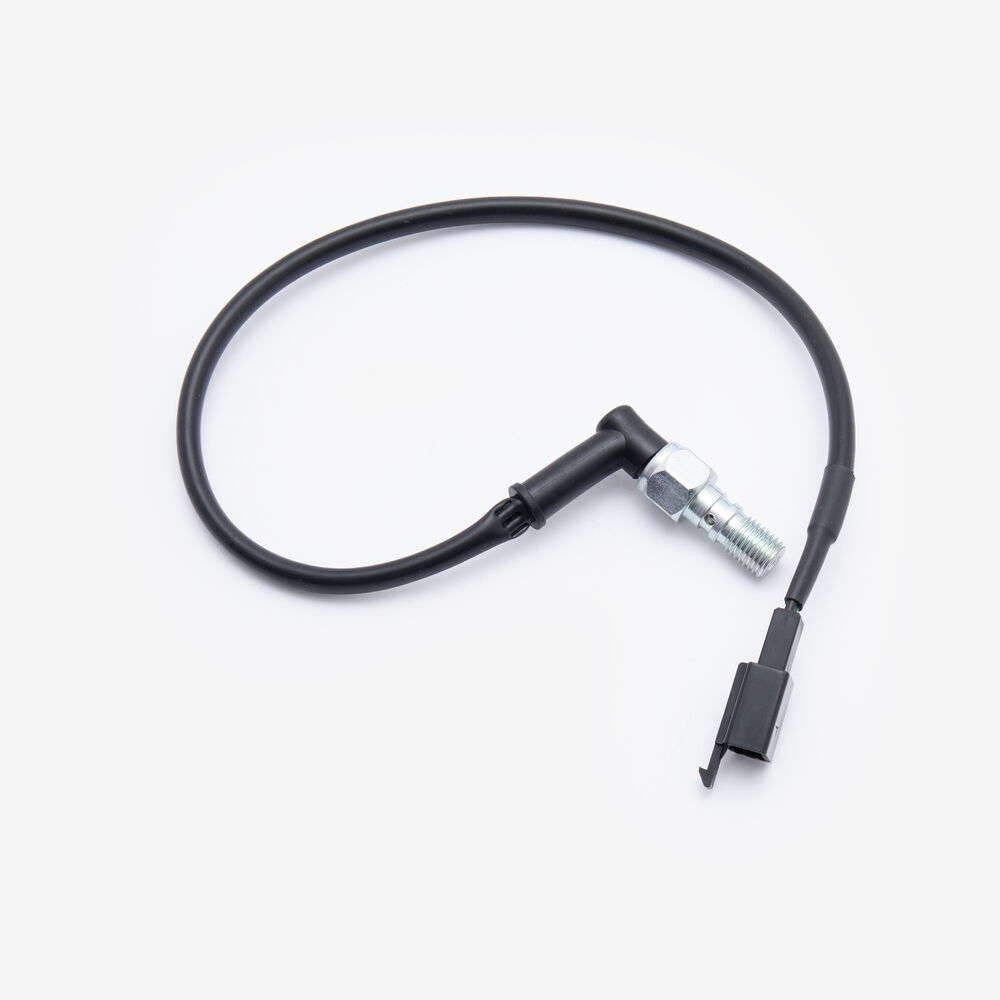 The rear brake switch spring or cable in a motorcycle connects the rear brake pedal to the brake light switch. When the rear brake is applied, the spring or cable actuates the switch, which then triggers the brake light to illuminate, signaling braking to other road users.