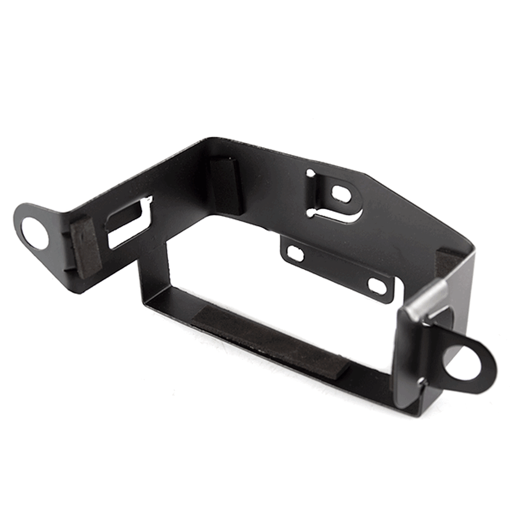 The battery bracket in a motorcycle is a mounting component that secures the battery within its designated compartment. It ensures the battery remains stable and properly aligned, preventing movement and potential damage while riding, and facilitating easy installation and removal.
