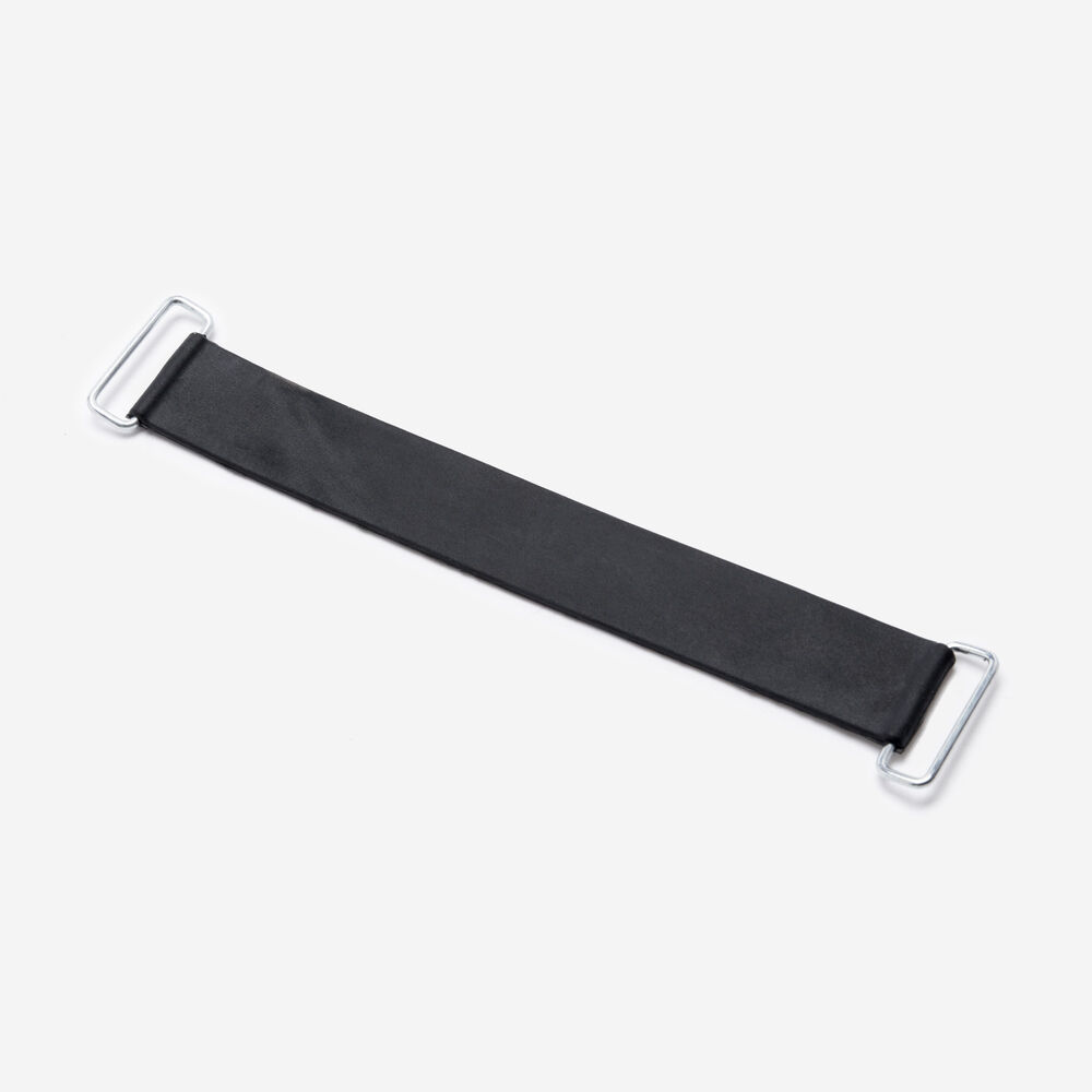 A battery strap in a motorcycle is a fastening device used to secure the motorcycle battery in place within its compartment. It prevents the battery from shifting or moving, which can help avoid damage to the battery terminals and ensure reliable electrical connections.