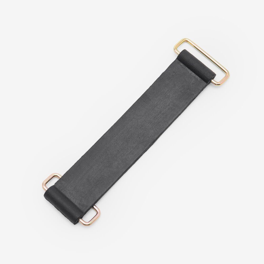 A battery strap in a motorcycle is a fastening device used to secure the motorcycle battery in place within its compartment. It prevents the battery from shifting or moving, which can help avoid damage to the battery terminals and ensure reliable electrical connections.