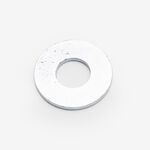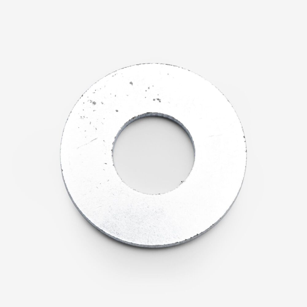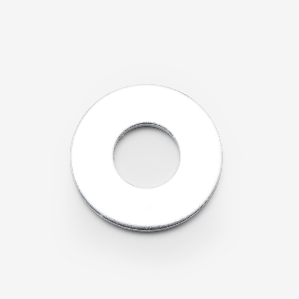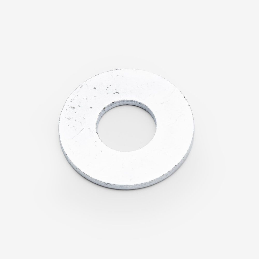 The chain adjuster washer in a motorcycle is a small, typically flat washer used in conjunction with the chain adjuster bolts or nuts. It helps to distribute the load evenly and prevent damage to the adjuster components, ensuring precise chain tension adjustments and maintaining proper alignment of the rear wheel.