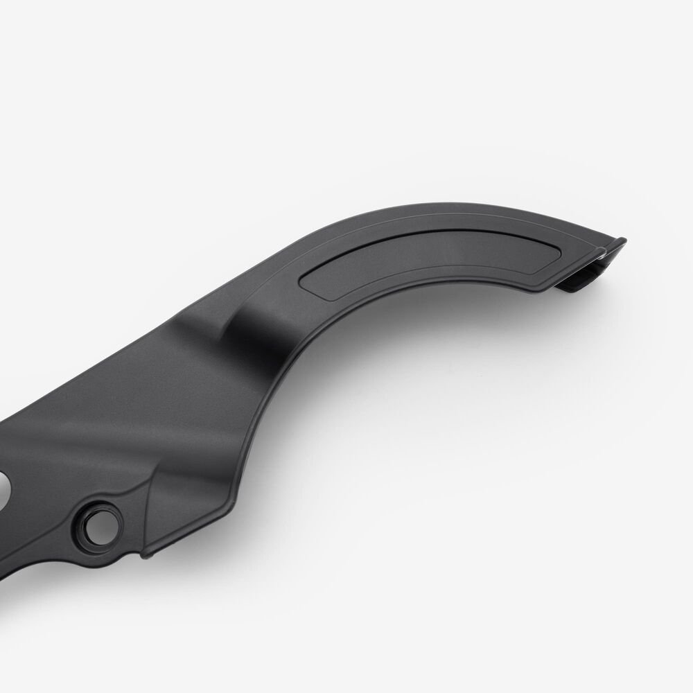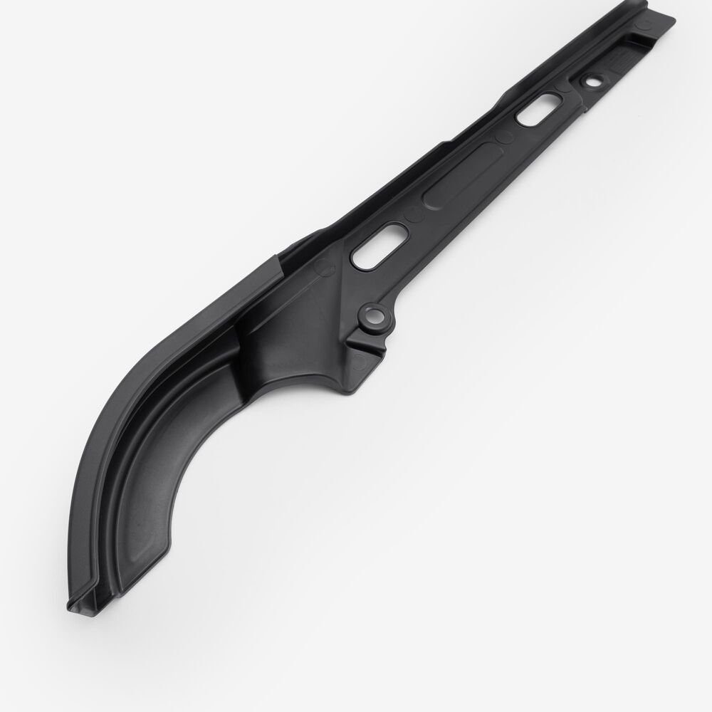The chain guard in a motorcycle is a protective cover that shields the chain from dirt, debris, and damage. It helps to prevent accidental contact with the chain, which could cause injury or affect performance, while also keeping the chain and surrounding components clean and functioning smoothly.