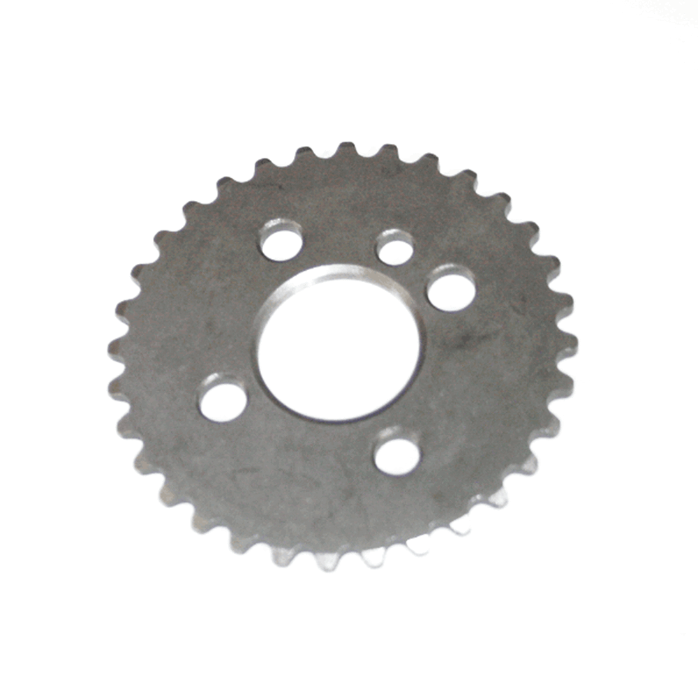 The camshaft sprocket in a motorcycle is a gear attached to the camshaft, which is driven by the timing chain. It ensures the precise timing of the camshaft's rotation, controlling the opening and closing of the engine's valves in synchronization with the piston's movement, crucial for efficient engine operation.