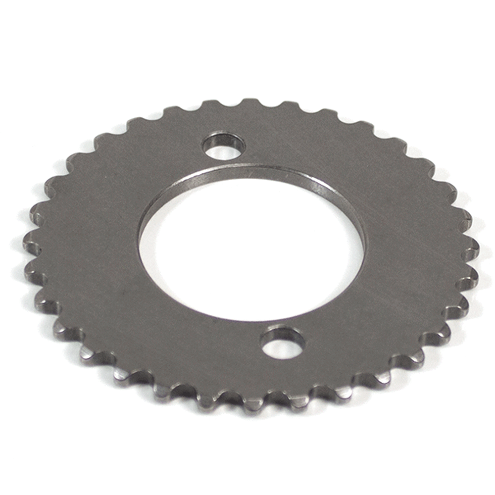 The camshaft sprocket in a motorcycle is a gear attached to the camshaft, which is driven by the timing chain. It ensures the precise timing of the camshaft's rotation, controlling the opening and closing of the engine's valves in synchronization with the piston's movement, crucial for efficient engine operation.
