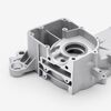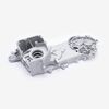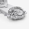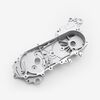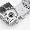 The crankcase in a motorcycle houses the engine's internal components on the side, including parts of the crankshaft, transmission, and oil pump. It provides structural support, protects these components, and ensures proper alignment and lubrication within the engine.