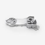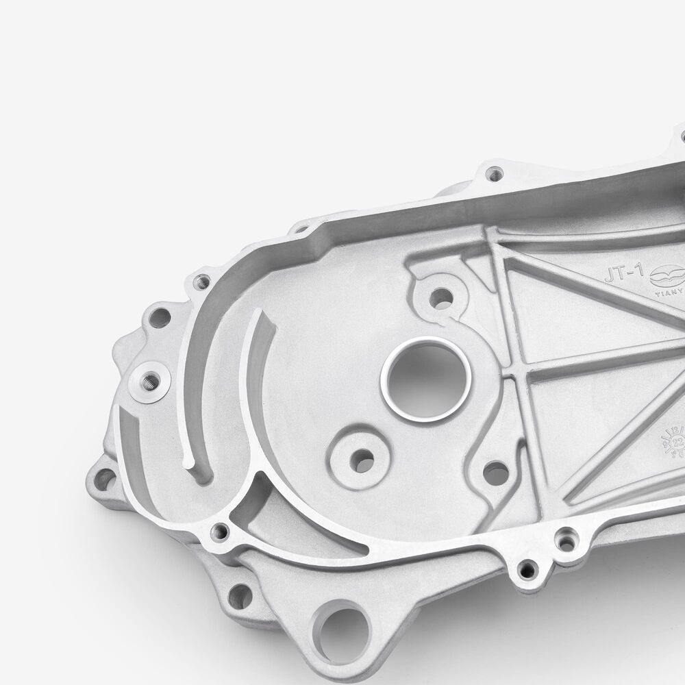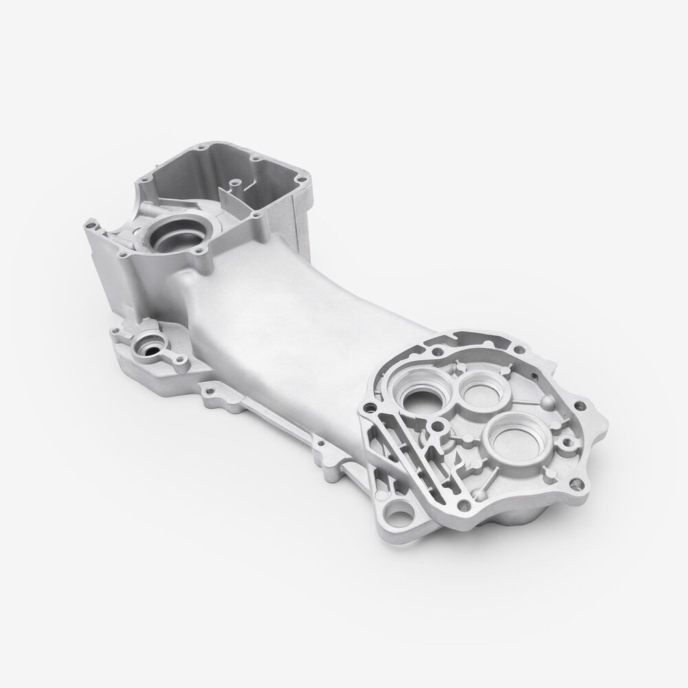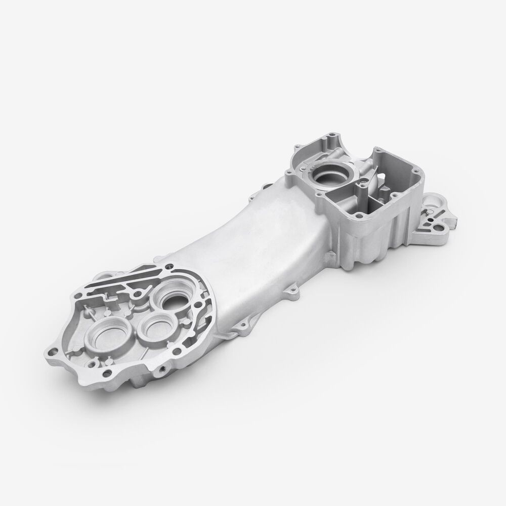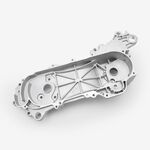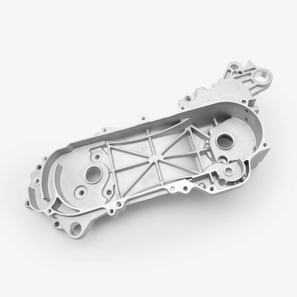 The crankcase in a motorcycle houses the engine's internal components on the side, including parts of the crankshaft, transmission, and oil pump. It provides structural support, protects these components, and ensures proper alignment and lubrication within the engine.