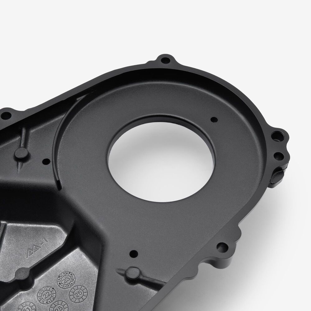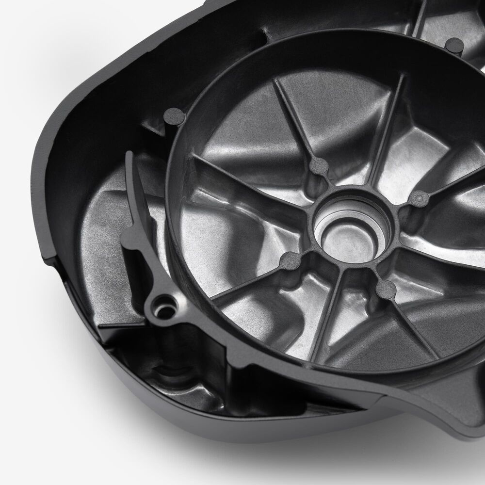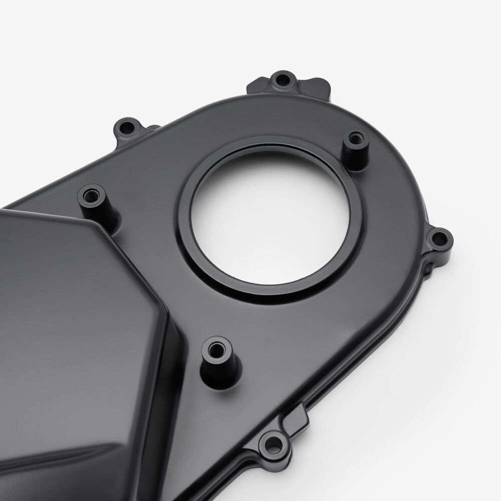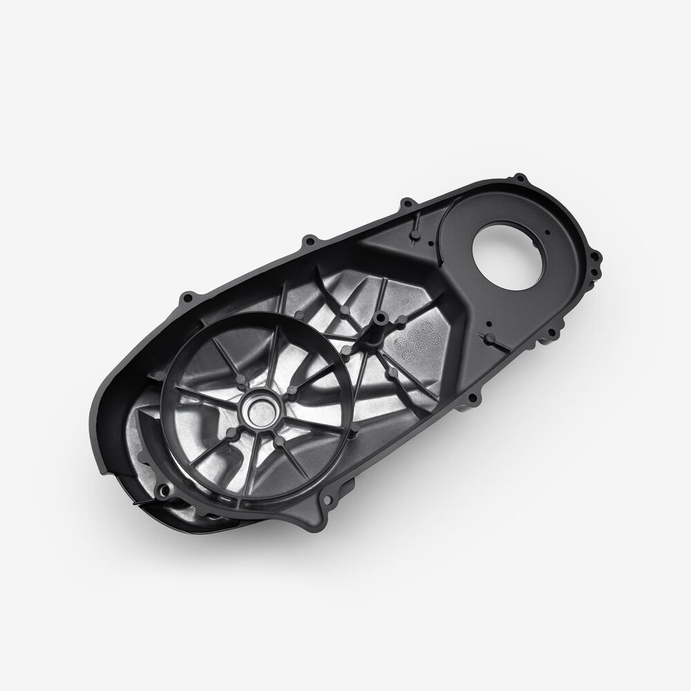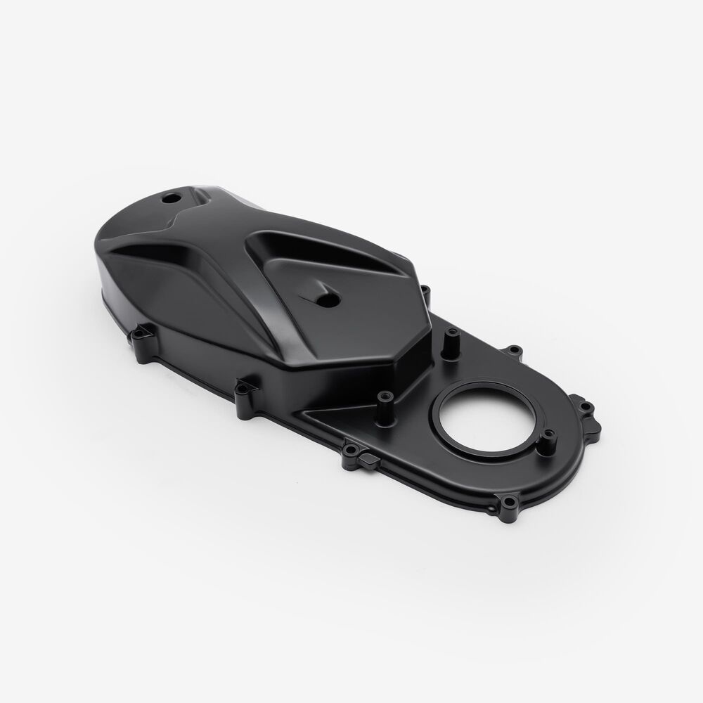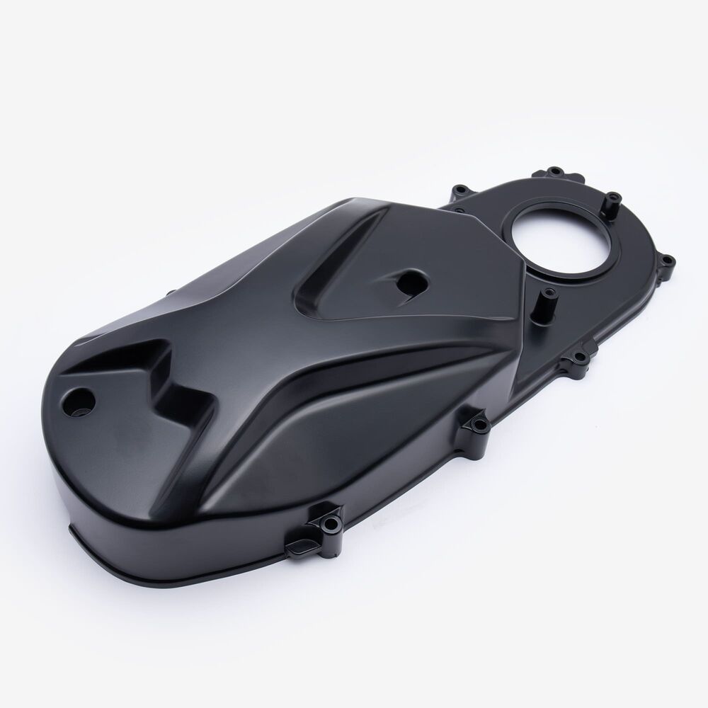 The crankcase in a motorcycle houses the engine's internal components on the side, including parts of the crankshaft, transmission, and oil pump. It provides structural support, protects these components, and ensures proper alignment and lubrication within the engine.