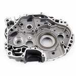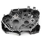 The crankcase in a motorcycle houses the engine's internal components on the side, including parts of the crankshaft, transmission, and oil pump. It provides structural support, protects these components, and ensures proper alignment and lubrication within the engine.