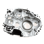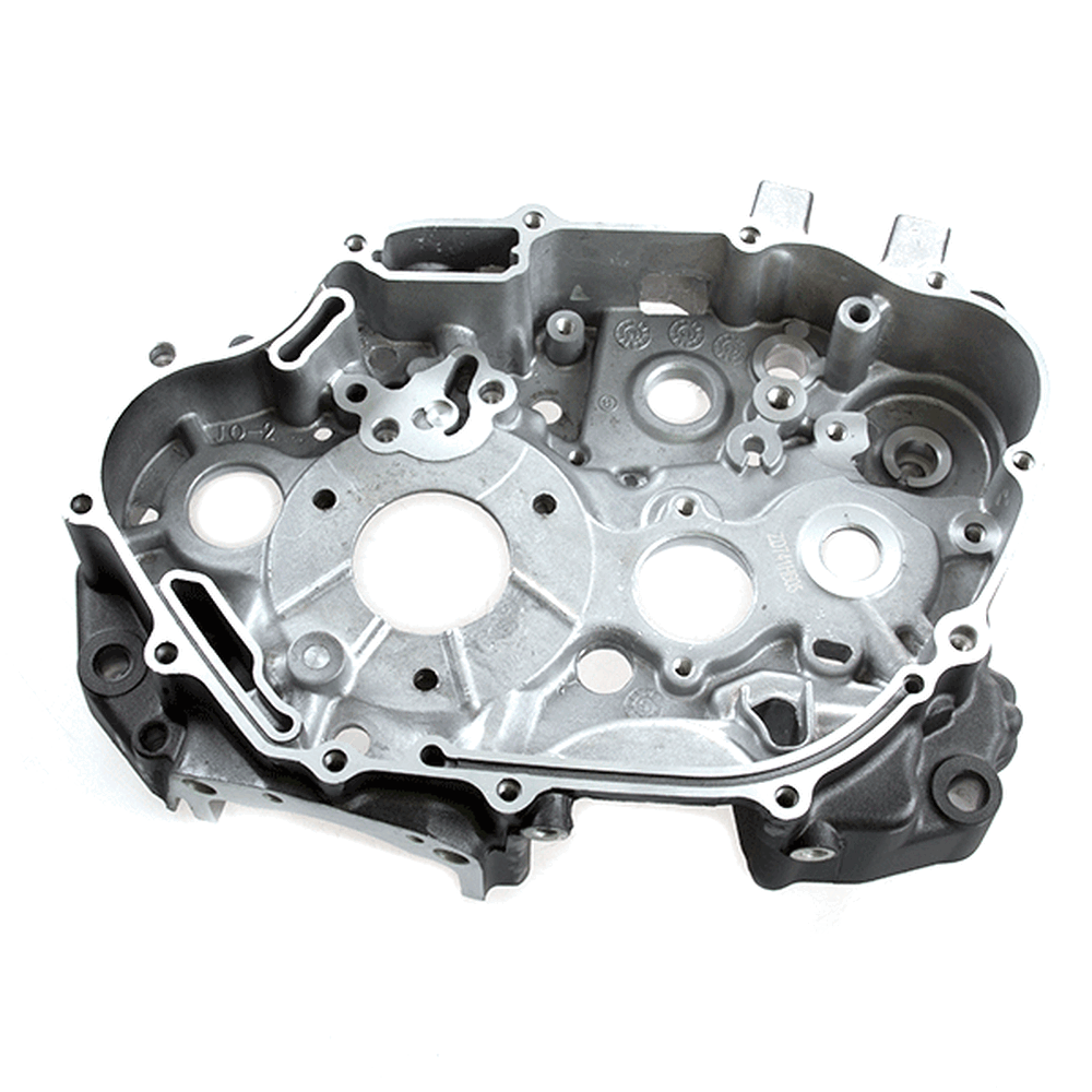 The crankcase in a motorcycle houses the engine's internal components on the side, including parts of the crankshaft, transmission, and oil pump. It provides structural support, protects these components, and ensures proper alignment and lubrication within the engine.