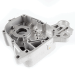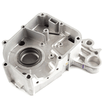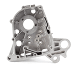 The crankcase in a motorcycle houses the engine's internal components on the side, including parts of the crankshaft, transmission, and oil pump. It provides structural support, protects these components, and ensures proper alignment and lubrication within the engine.