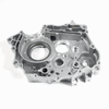 The crankcase in a motorcycle houses the engine's internal components on the side, including parts of the crankshaft, transmission, and oil pump. It provides structural support, protects these components, and ensures proper alignment and lubrication within the engine.