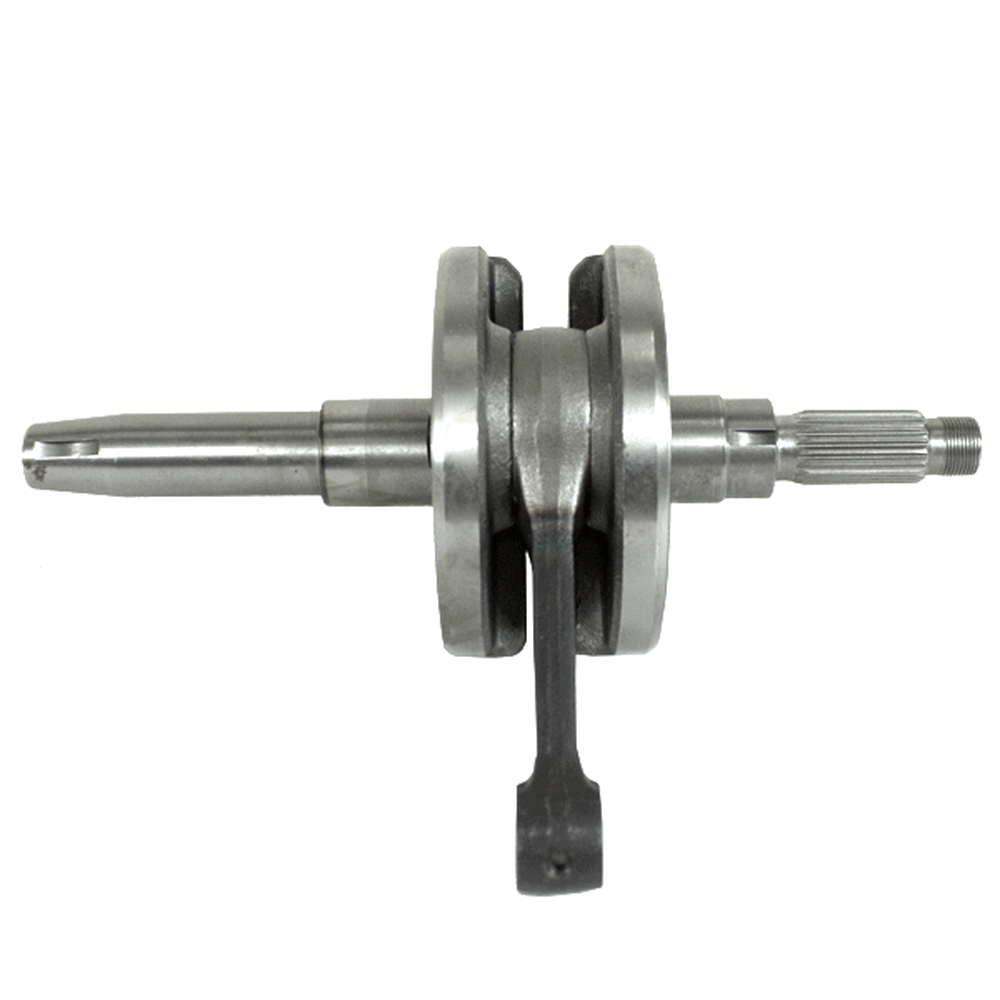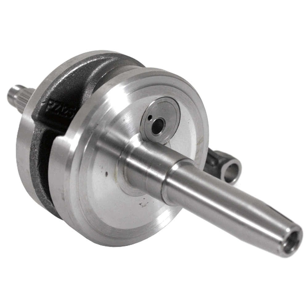 The crankshaft in a motorcycle converts the linear motion of the pistons into rotational motion, which powers the transmission and ultimately drives the rear wheel. It is a crucial component for engine function, ensuring smooth and efficient power delivery by linking the piston movement to the engine's output.
