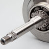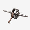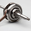 The crankshaft in a motorcycle converts the linear motion of the pistons into rotational motion, which powers the transmission and ultimately drives the rear wheel. It is a crucial component for engine function, ensuring smooth and efficient power delivery by linking the piston movement to the engine's output.
