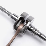 The crankshaft in a motorcycle converts the linear motion of the pistons into rotational motion, which powers the transmission and ultimately drives the rear wheel. It is a crucial component for engine function, ensuring smooth and efficient power delivery by linking the piston movement to the engine's output.
