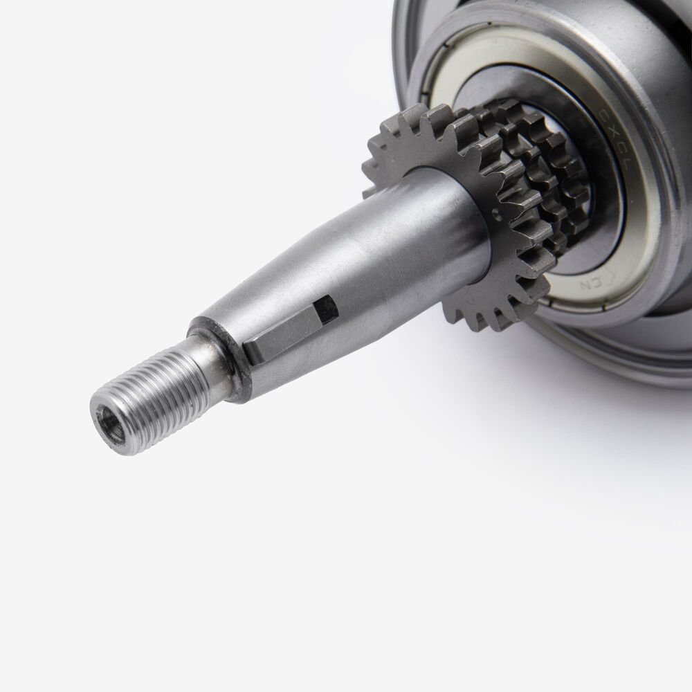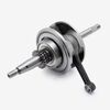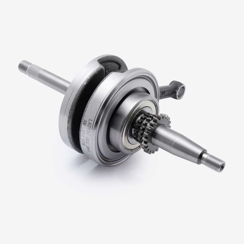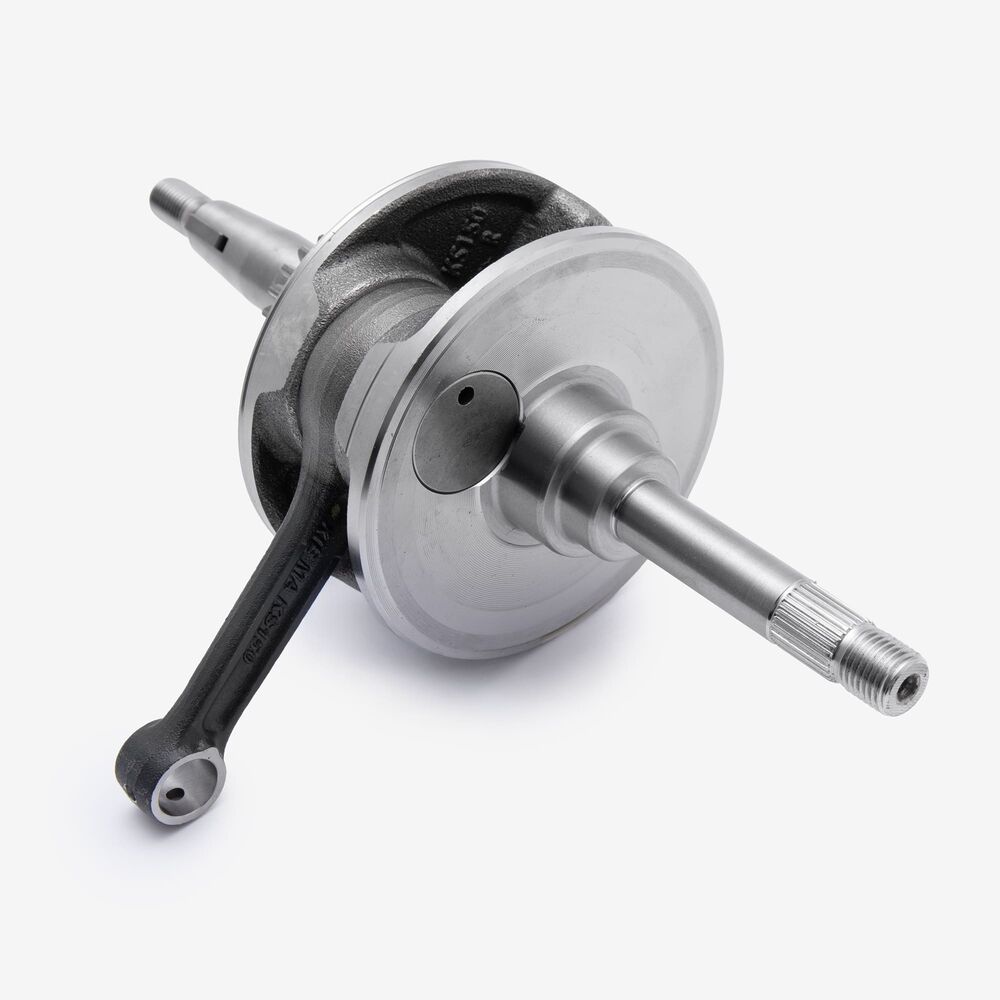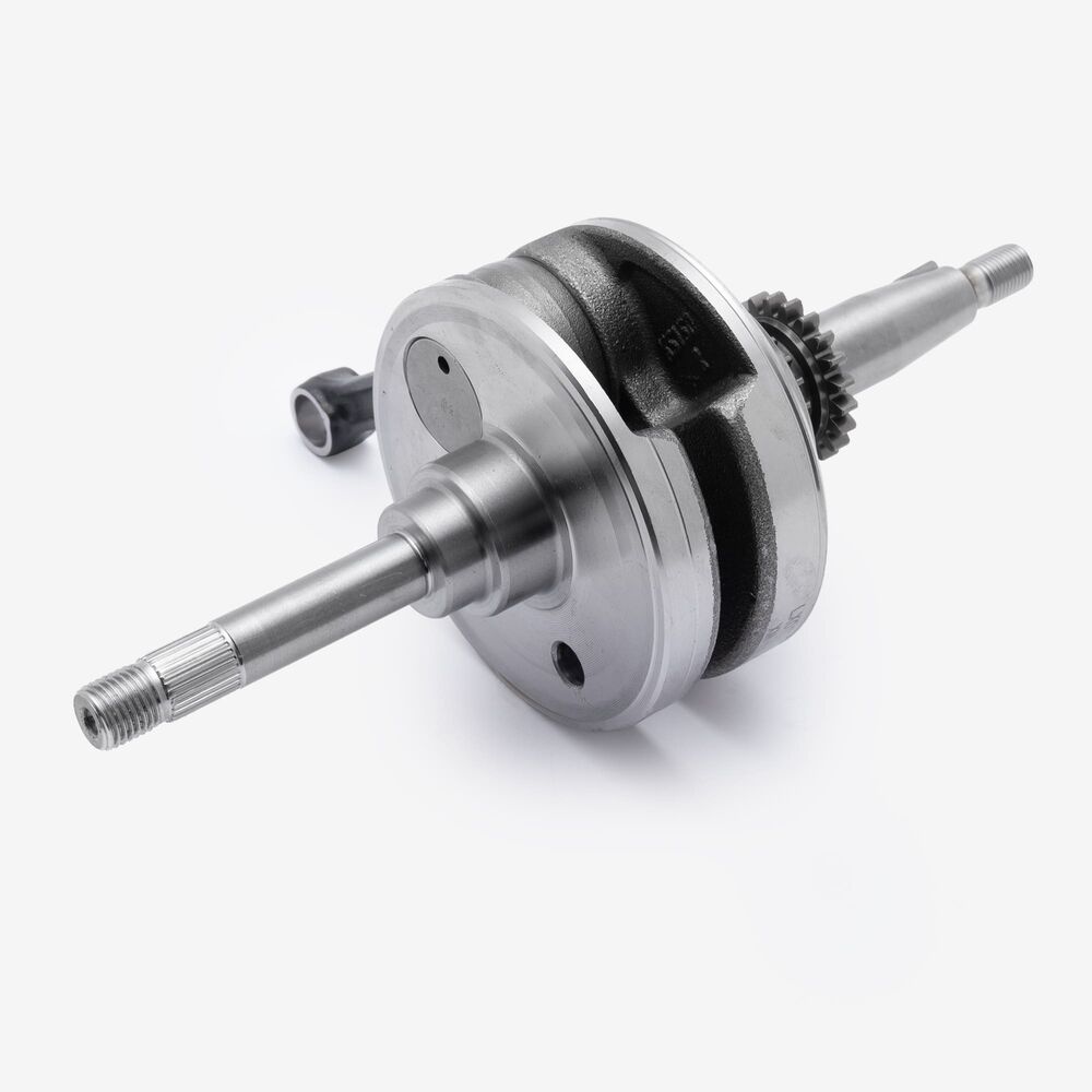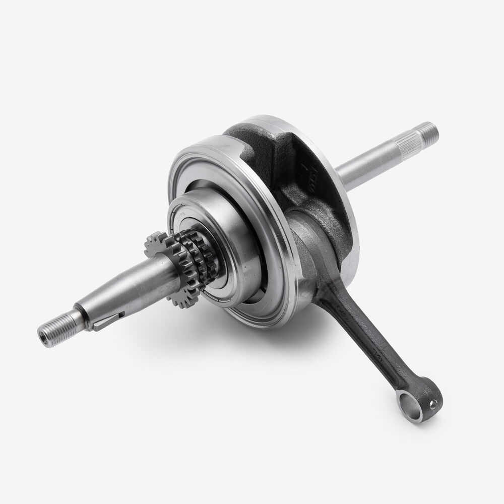 The crankshaft in a motorcycle converts the linear motion of the pistons into rotational motion, which powers the transmission and ultimately drives the rear wheel. It is a crucial component for engine function, ensuring smooth and efficient power delivery by linking the piston movement to the engine's output.