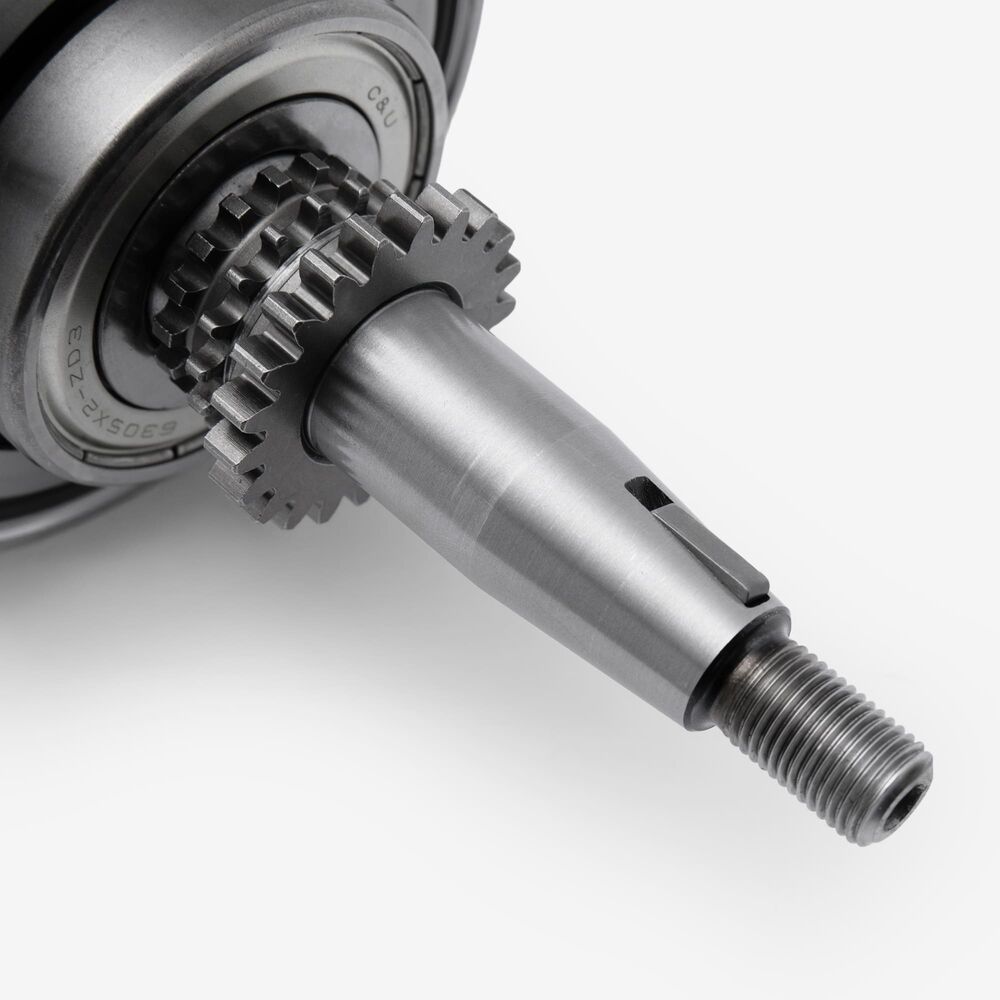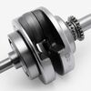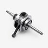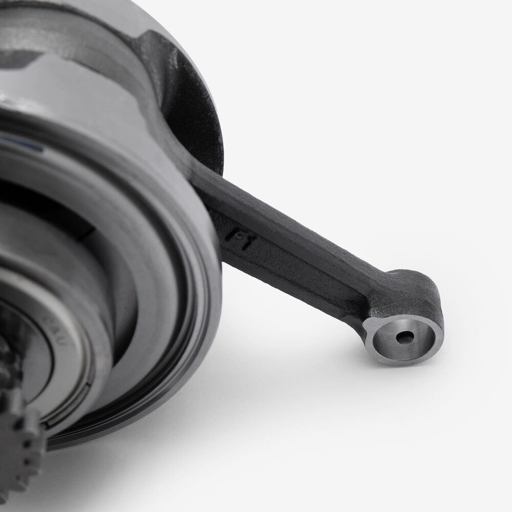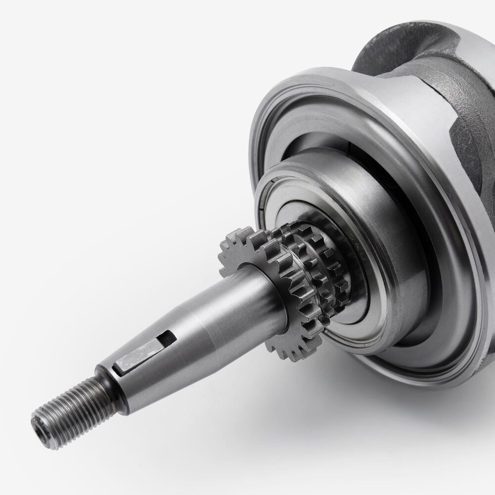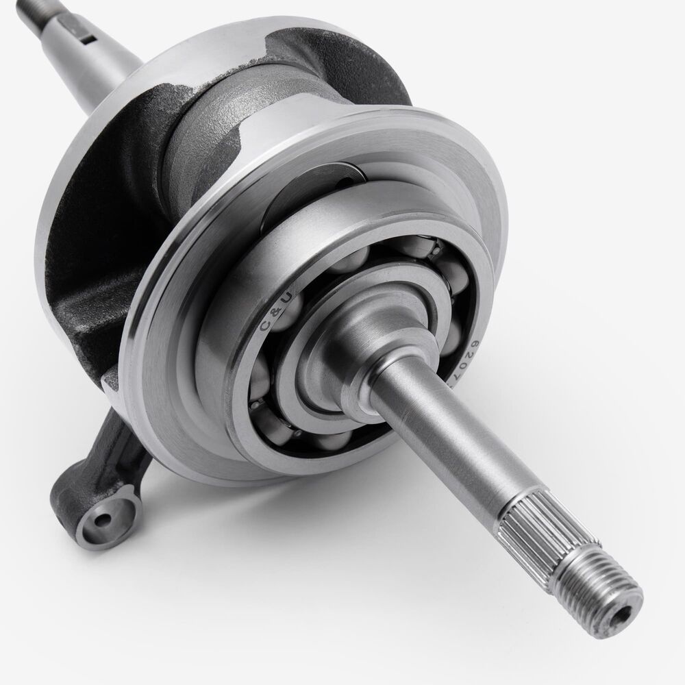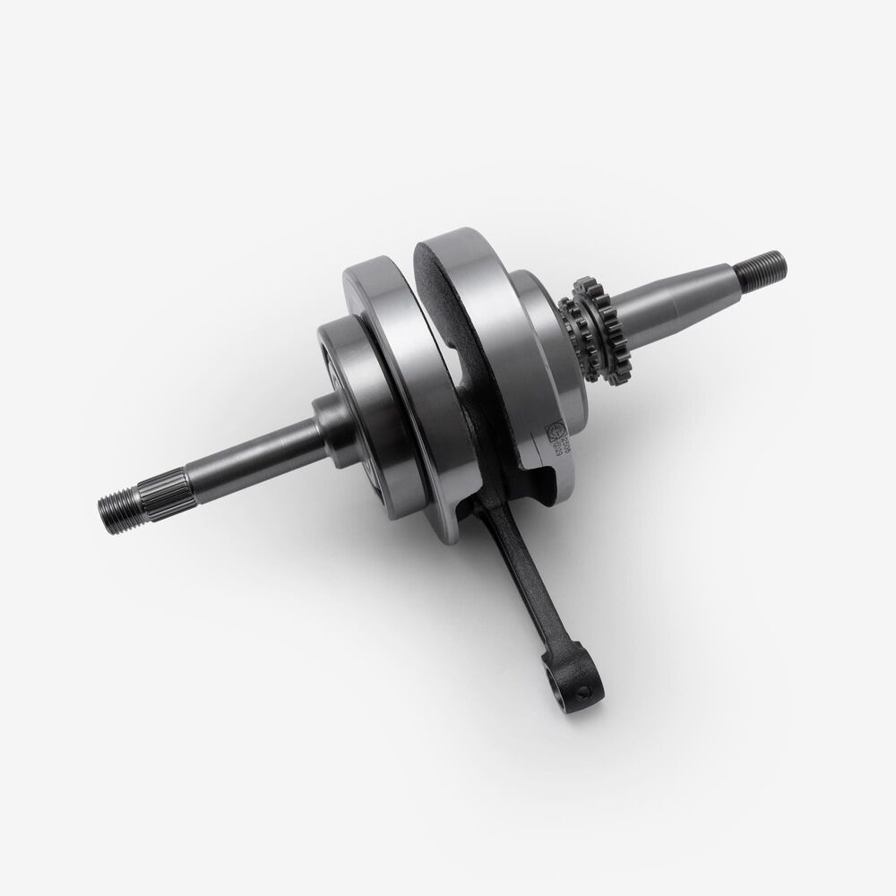The crankshaft in a motorcycle converts the linear motion of the pistons into rotational motion, which powers the transmission and ultimately drives the rear wheel. It is a crucial component for engine function, ensuring smooth and efficient power delivery by linking the piston movement to the engine's output.