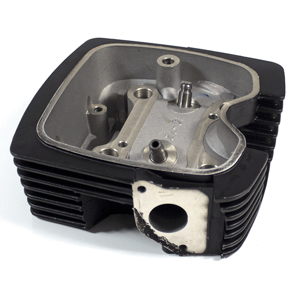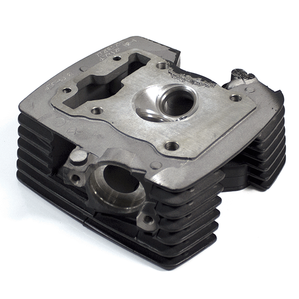 The cylinder head in a motorcycle is a critical engine component that sits atop the cylinder block, housing the intake and exhaust valves, camshaft, and other vital elements. It facilitates the intake of air-fuel mixture and the expulsion of exhaust gases, while also sealing the combustion chamber to ensure efficient engine performance and power generation.