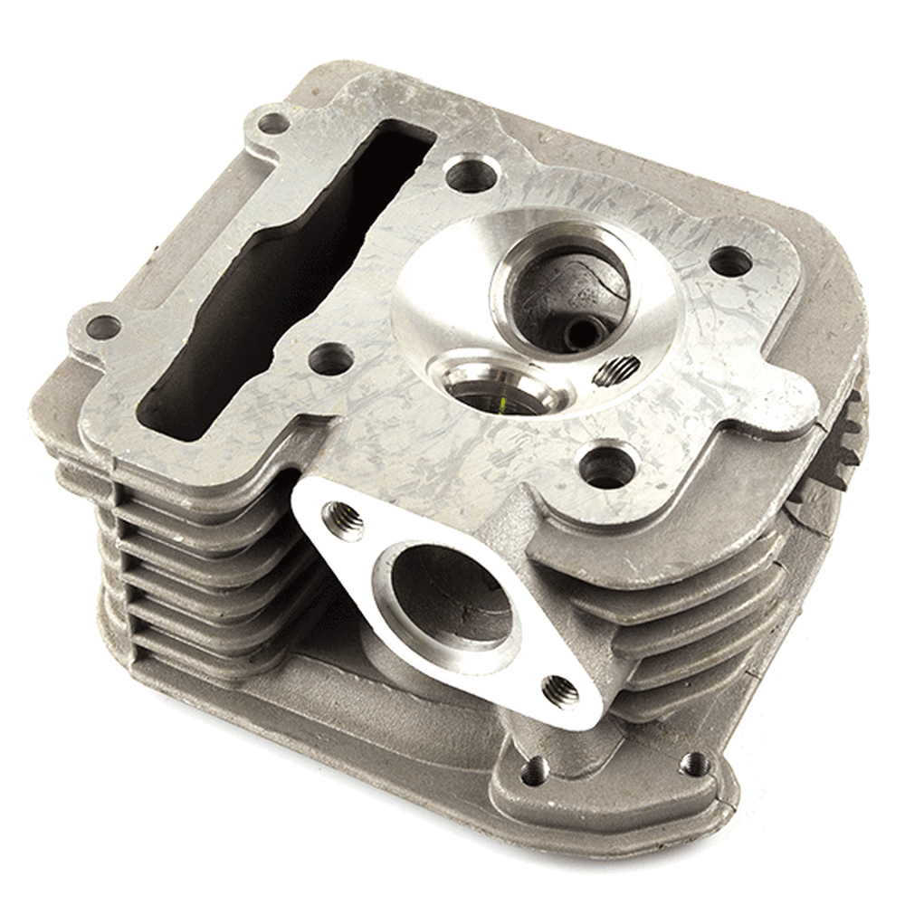 The cylinder head in a motorcycle is a critical engine component that sits atop the cylinder block, housing the intake and exhaust valves, camshaft, and other vital elements. It facilitates the intake of air-fuel mixture and the expulsion of exhaust gases, while also sealing the combustion chamber to ensure efficient engine performance and power generation.