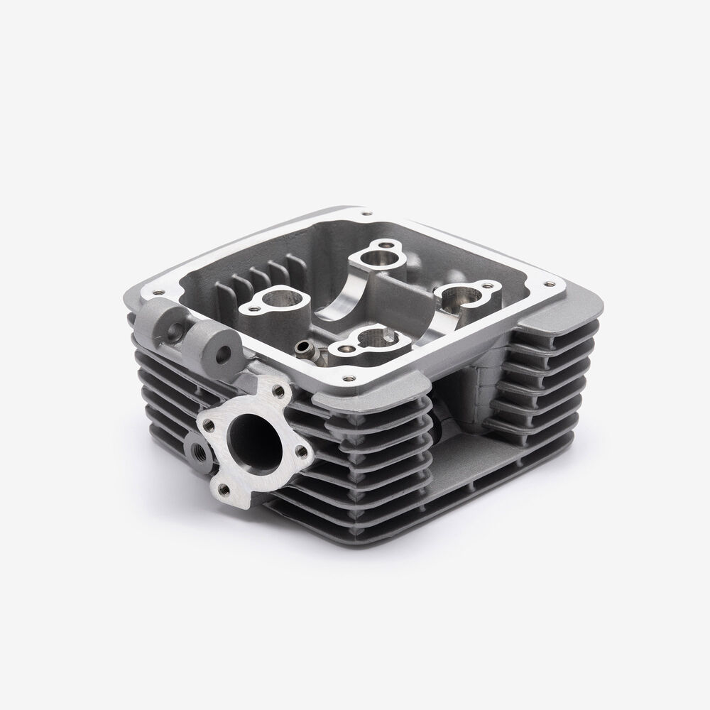 The cylinder head in a motorcycle is a critical engine component that sits atop the cylinder block, housing the intake and exhaust valves, camshaft, and other vital elements. It facilitates the intake of air-fuel mixture and the expulsion of exhaust gases, while also sealing the combustion chamber to ensure efficient engine performance and power generation.