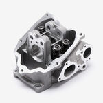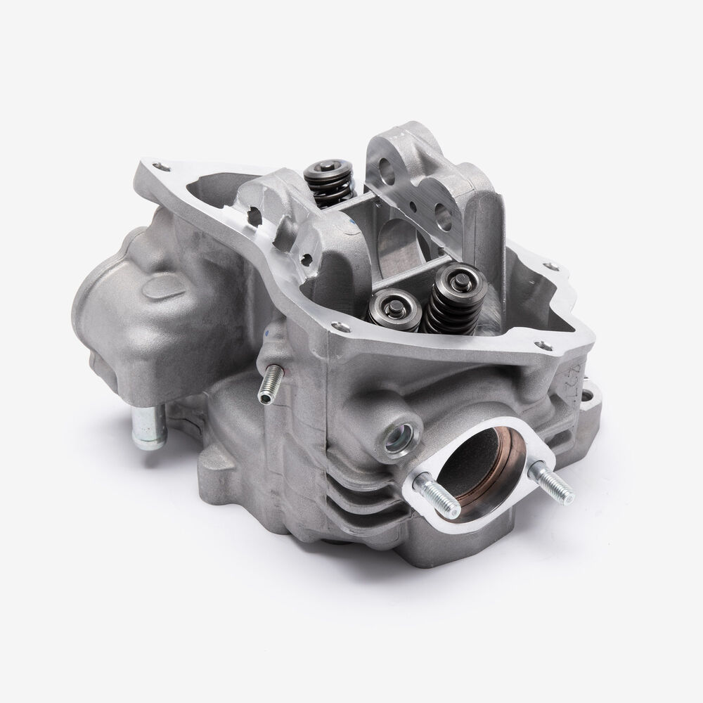 The cylinder head in a motorcycle is a critical engine component that sits atop the cylinder block, housing the intake and exhaust valves, camshaft, and other vital elements. It facilitates the intake of air-fuel mixture and the expulsion of exhaust gases, while also sealing the combustion chamber to ensure efficient engine performance and power generation.