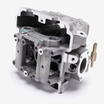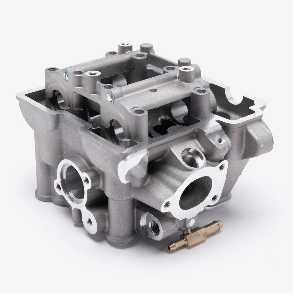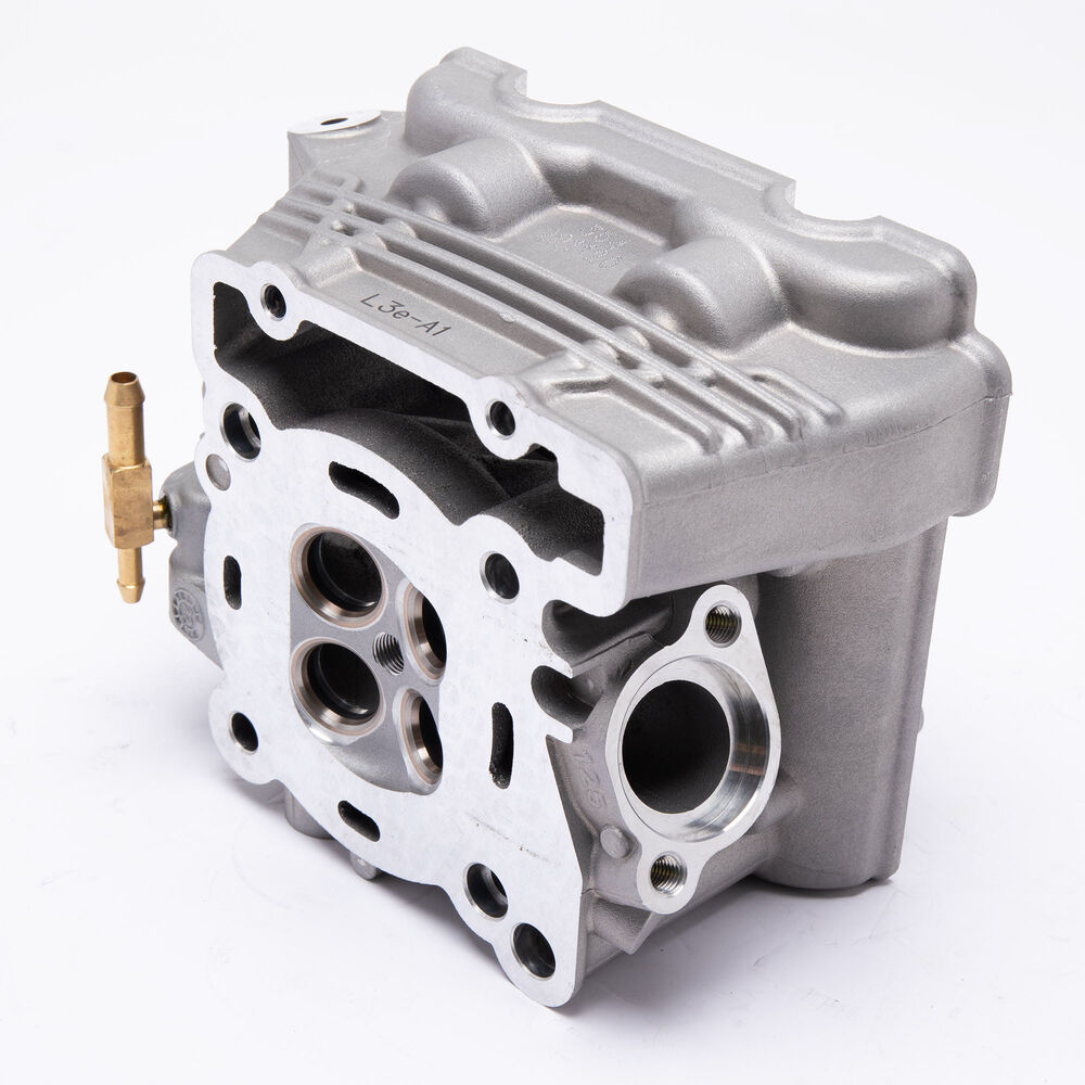 The cylinder head in a motorcycle is a critical engine component that sits atop the cylinder block, housing the intake and exhaust valves, camshaft, and other vital elements. It facilitates the intake of air-fuel mixture and the expulsion of exhaust gases, while also sealing the combustion chamber to ensure efficient engine performance and power generation.
